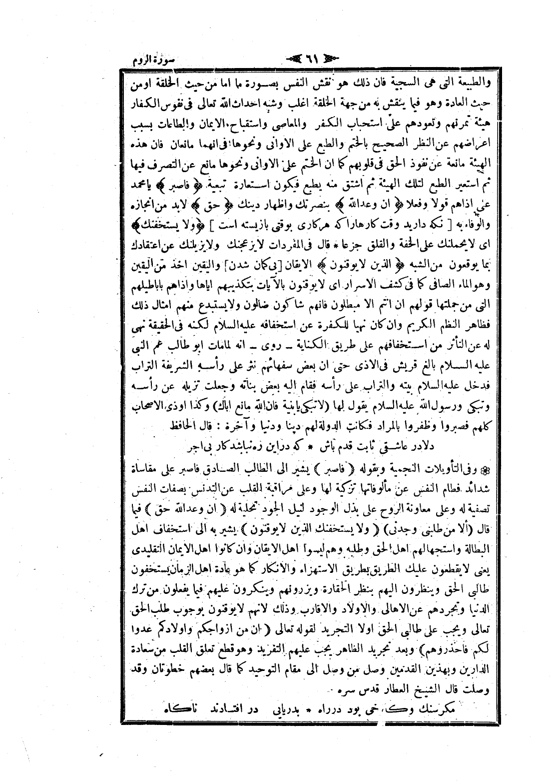 وفى التأويلات النجمية وبقوله (فَاصْبِرْ) يشير الى الطالب الصادق فاصبر على مقاساة شدائد فطام النفس عن مألوفاتها تزكية لها وعلى مراقبة القلب عن التدنس بصفات النفس تصفية له وعلى معاونة الروح على بذل الوجود لنيل الجود تحلية له (إِنَّ وَعْدَ اللَّهِ حَقٌّ) فيما قال (ألا من طلبنى وجدنى) (وَلا يَسْتَخِفَّنَّكَ الَّذِينَ لا يُوقِنُونَ) يشير به الى استخفاف اهل البطالة واستجهالهم اهل الحق وطلبه وهم ليسوا اهل الإيقان وان كانوا اهل الايمان التقليدى يعنى لا يقطعون عليك الطريق بطريق الاستهزاء والإنكار كما هو عادة اهل الزمان يستخفون طالبى الحق وينظرون إليهم بنظر الحقارة ويزرونهم وينكرون عليهم فيما يفعلون من ترك الدنيا وتجردهم عن الاهالى والأولاد والأقارب وذلك لانهم لا يوقنون بوجوب طلب الحق تعالى ويجب على طالبى الحق اولا التجريد لقوله تعالى (إِنَّ مِنْ أَزْواجِكُمْ وَأَوْلادِكُمْ عَدُوًّا لَكُمْ فَاحْذَرُوهُمْ) وبعد تجريد الظاهر يجب عليهم التفريد وهو قطع تعلق القلب من سعادة الدارين وبهذين القدمين وصل من وصل الى مقام التوحيد كما قال بعضهم خطوتان وقد وصلت قال الشيخ العطار قدس سره