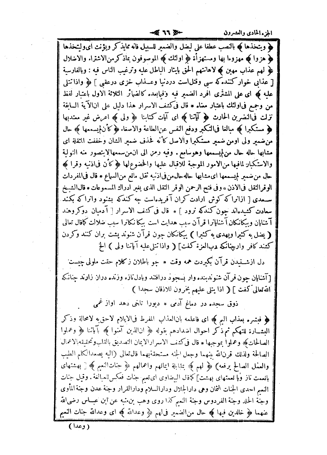 وَيَتَّخِذَها بالنصب عطفا على ليضل والضمير للسبيل فانه مما يذكر ويؤنث اى وليتخذها هُزُواً مهزوءا بها ومستهزأة أُولئِكَ الموصوفون بما ذكر من الاشتراء والإضلال لَهُمْ عَذابٌ مُهِينٌ لاهانتهم الحق بايثار الباطل عليه وترغيب الناس فيه: وبالفارسية [عذابى خوار كننده كه سبى وقتل است در دنيا وعذاب خزى در عقبى] وَإِذا تُتْلى عَلَيْهِ اى على المشترى أفرد الضمير فيه وفيما بعده كالضمائر الثلاثة الاول باعتبار لفظ من وجمع فى أولئك باعتبار معناه قال فى كشف الاسرار هذا دليل على ان الآية السابقة نزلت فى النضر بن الحارث آياتُنا اى آيات كتابنا وَلَّى اعرض غير معتد بها مُسْتَكْبِراً مبالغا فى التكبر ودفع النفس عن الطاعة والإصغاء كَأَنْ لَمْ يَسْمَعْها حال من ضمير ولى او من ضمير مستكبرا والأصل كأنه فخذف ضمير الشان وخففت المثقلة اى مشابها حاله حال من لم يسمعها وهو سامع. وفيه رمز الى ان من سمعها لا يتصور منه التولية والاستكبار لما فيها من الأمور الموجبة للاقبال عليها والخضوع لها كَأَنَّ فِي أُذُنَيْهِ وَقْراً حال من ضمير لم يسمعها اى مشابها حاله حال من فى اذنيه ثقل مانع من السماع قال فى المفردات الوقر الثقل فى الاذن وفى فتح الرحمن الوقر الثقل الذي يغير ادراك المسموعات قال الشيخ سعدى [از آنرا كه كوش أرادت كران آفريده است چهـ كند كه بشنود وانرا كه بكند سعادت كشيده اند چون كند كه نرود] قال فى كشف الاسرار [آدميان دو كروهند آشنايان وبيكانكان آشنايان را قرآن سبب هدايت است بيكانكانرا سبب ضلالت كما قال تعالى (يُضِلُّ بِهِ كَثِيراً وَيَهْدِي بِهِ كَثِيراً) بيكانكان چون قرآن شنوند پشت بران كنند وكردن كشند كافروار چنانكه رب العزة كفت] إِذا تُتْلى عَلَيْهِ آياتُنا وَلَّى) إلخ