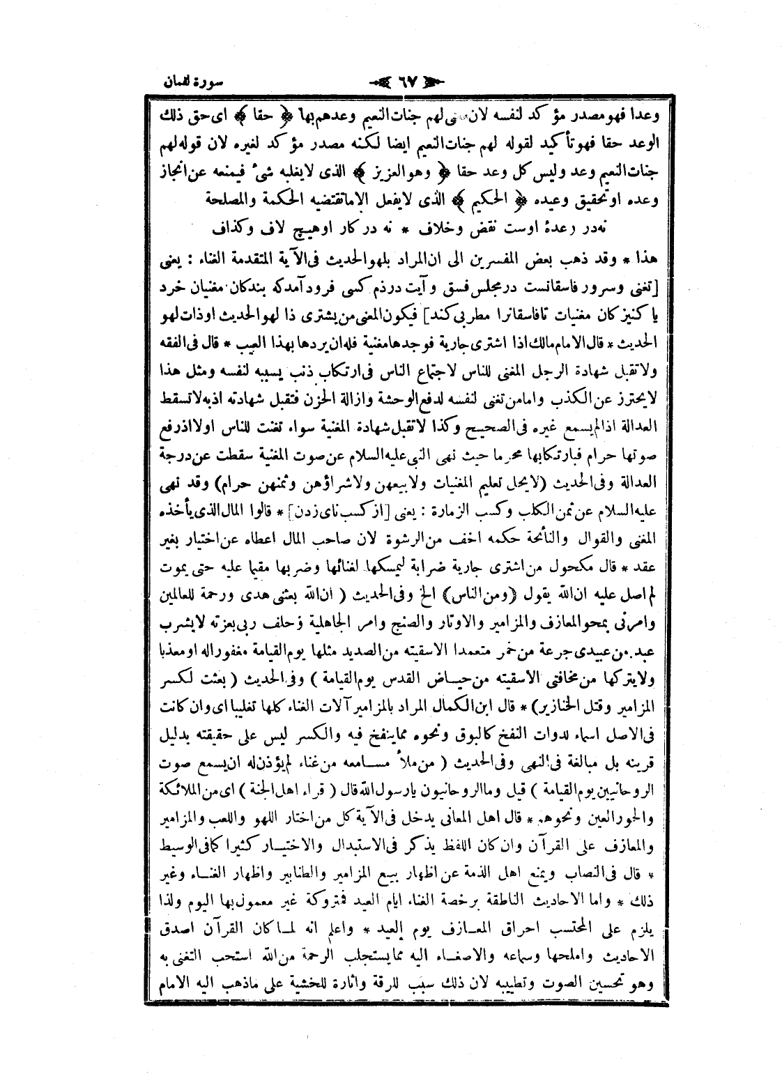 هذا وقد ذهب بعض المفسرين الى ان المراد بلهو الحديث فى الآية المتقدمة الغناء: يعنى [تغنى وسرور فاسقانست در مجلس فسق وآيت در ذم كسى فرود آمد كه بندگان مغنيان خرد يا كنيزكان مغنيات تا فاسقانرا مطربى كند] فيكون المعنى من يشترى ذا لهو الحديث او ذات لهو الحديث قال الامام مالك إذا اشترى جارية فوجدها مغنية فله ان يردها بهذا العيب قال فى الفقه ولا تقبل شهادة الرجل المغني للناس لاجتماع الناس فى ارتكاب ذنب يسببه لنفسه ومثل هذا لا يحترز عن الكذب واما من تغنى لنفسه لدفع الوحشة وازالة الحزن فتقبل شهادته إذ به لا تسقط العدالة إذا لم يسمع غيره فى الصحيح وكذا لا تقبل شهادة المغنية سواء تغنت للناس اولا إذ رفع صوتها حرام فبارتكابها محرما حيث نهى النبي عليه السلام عن صوت المغنية سقطت عن درجة العدالة