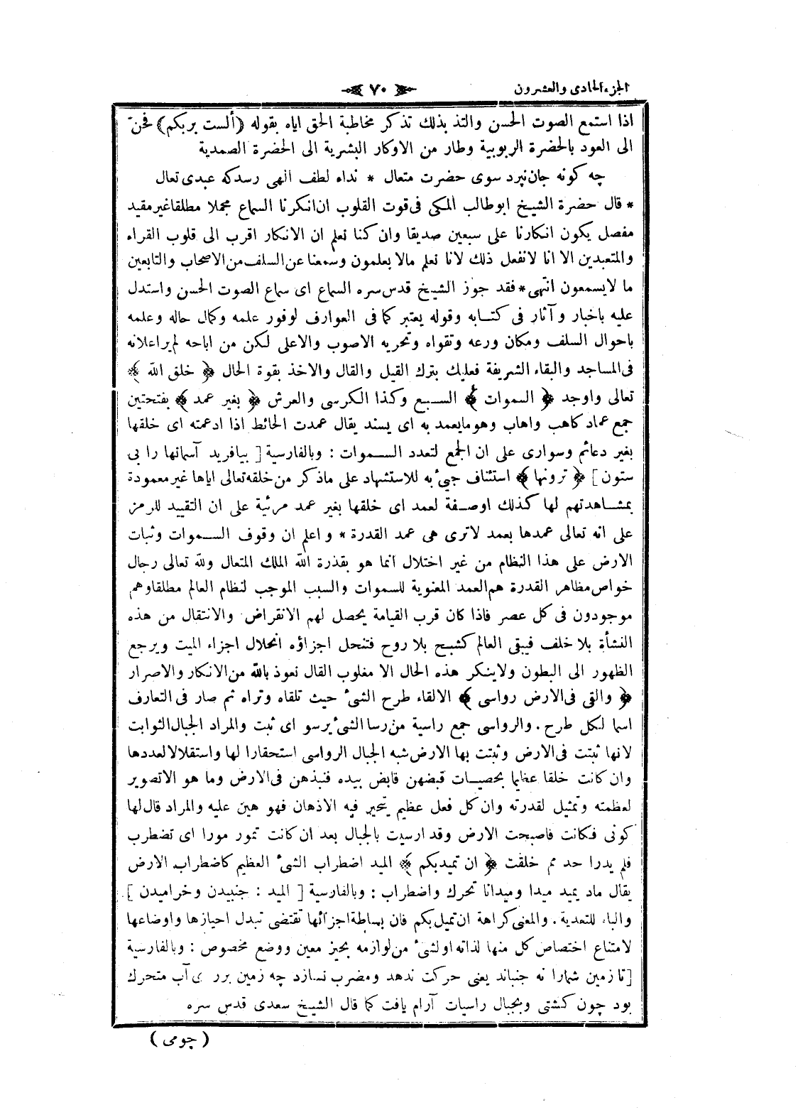 قال حضرة الشيخ ابو طالب المكي فى قوت القلوب ان أنكرنا السماع مجملا مطلقا غير مقيد مفصل يكون إنكارنا على سبعين صديقا وان كنا نعلم ان الإنكار اقرب الى قلوب القراء والمتعبدين الا انا لا نفعل ذلك لانا نعلم ما لا يعلمون وسمعنا عن السلف من الاصحاب والتابعين ما لا يسمعون انتهى فقد جوز الشيخ قدس سره السماع اى سماع الصوت الحسن واستدل عليه بأخبار وآثار فى كتابه وقوله يعتبر كما فى العوارف لوفور علمه وكمال حاله وعلمه بأحوال السلف ومكان ورعه وتقواه وتحريه الأصوب والأعلى لكن من اباحه لم ير إعلانه فى المساجد والبقاء الشريفة فعليك بترك القيل والقال والاخذ بقوة الحال خَلَقَ الله تعالى وأوجد السَّماواتِ السبع وكذا الكرسي والعرش بِغَيْرِ عَمَدٍ بفتحتين جمع عماد كاهب وإهاب وهو ما يعمد به اى يسند يقال عمدت الحائط إذا ادعمته اى خلقها بغير دعائم وسوارى على ان الجمع لتعدد السموات: وبالفارسية [بيافريد آسمانها را بي ستون] تَرَوْنَها استئناف جيىء به للاستشهاد على ما ذكر من خلقه تعالى إياها غير معمودة بمشاهدتهم لها كذلك او صفة لعمد اى خلقها بغير عمد مرئية على ان التقييد للرمز على انه تعالى عمدها بعمد لا ترى هى عمد القدرة واعلم ان وقوف السموات وثبات الأرض على هذا النظام من غير اختلال انما هو بقدرة الله الملك المتعال ولله تعالى رجال خواص مظاهر القدرة هم العمد المعنوية للسموات والسبب الموجب لنظام العالم مطلقا وهم موجودون فى كل عصر فاذا كان قرب القيامة يحصل لهم الانقراض والانتقال من هذه النشأة بلا خلف فيبقى العالم كشبح بلا روح فتنحل اجزاؤه انحلال اجزاء الميت ويرجع الظهور الى البطون ولا ينكر هذه الحال الا مغلوب القال نعوذ بالله من الإنكار والإصرار وَأَلْقى فِي الْأَرْضِ رَواسِيَ الإلقاء طرح الشيء حيث تلقاه وتراه ثم صار فى التعارف اسما لكل طرح. والرواسي جمع راسية من رسا الشيء يرسو اى ثبت والمراد الجبال الثوابت لانها ثبتت فى الأرض وثبتت بها الأرض شبه الجبال الرواسي استحقارا لها واستقلالا لعددها وان كانت خلقا عظيما بحصيات قبضهن قابض بيده فنبذهن فى الأرض وما هو إلا تصوير لعظمته وتمثيل لقدرته وان كل فعل عظيم يتحير فيه الأذهان فهو هين عليه والمراد قال لها كونى فكانت فاصبحت الأرض وقد أرسيت بالجبال بعد ان كانت تمور مورا اى تضطرب فلم يدرا حد مم خلقت أَنْ تَمِيدَ بِكُمْ الميد اضطراب الشيء العظيم كاضطراب الأرض يقال ماد يميد ميدا وميدانا تحرك واضطراب: وبالفارسية [الميد: جنبيدن وخراميدن] والباء للتعدية. والمعنى كراهة ان تميل بكم فان بساطة اجزائها تقتضى تبدل أحيازها وأوضاعها لامتناع اختصاص كل منها لذاته او لشىء من لوازمه بحيز معين ووضع مخصوص: وبالفارسية [تا زمين شما را نه جنباند يعنى حركت ندهد ومضرب نسازد چهـ زمين بر روى آب متحرك بود چون كشتى وبجبال راسيات آرام يافت كما قال الشيخ سعدى قدس سره