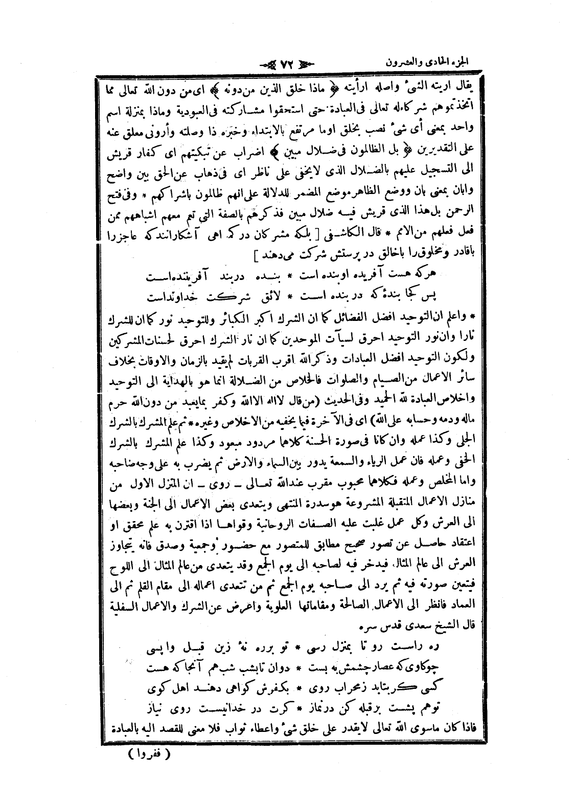 واعلم ان التوحيد أفضل الفضائل كما ان الشرك اكبر الكبائر وللتوحيد نور كما ان للشرك نارا وان نور التوحيد احرق لسيئات الموحدين كما ان نار الشرك احرق لحسنات المشركين ولكون التوحيد أفضل العبادات وذكر الله اقرب القربات لم يقيد بالزمان والأوقات بخلاف سائر الأعمال من الصيام والصلوات فالخلاص من الضلالة انما هو بالهداية الى التوحيد واخلاص العبادة لله الحميد وفى الحديث (من قال لا اله الا الله وكفر بما يعبد من دون الله حرم ماله ودمه وحسابه على الله) اى فى الآخرة فيما يخفيه من الإخلاص وغيره ثم علم المشرك بالشرك الجلى وكذا عمله وان كانا فى صورة الحسنة كلاهما مردود مبعود وكذا علم المشرك بالشرك الخفي وعمله فان عمل الرياء والسمعة يدور بين السماء والأرض ثم يضرب به على وجه صاحبه واما المخلص وعمله فكلاهما محبوب مقرب عند الله تعالى- روى- ان المنزل الاول من منازل الأعمال المتقبلة المشروعة هو سدرة المنتهى ويتعدى بعض الأعمال الى الجنة وبعضها الى العرش وكل عمل غلبت عليه الصفات الروحانية وقواها إذا اقترن به علم محقق او اعتقاد حاصل عن تصور صحيح مطابق للمتصور مع حضور وجمعية وصدق فانه يتجاوز العرش الى عالم المثال فيدخر فيه لصاحبه الى يوم الجمع وقد يتعدى من عالم المثال الى اللوح فيتعين صورته فيه ثم يرد الى صاحبه يوم الجمع ثم من تتعدى اعماله الى مقام القلم ثم الى العماد فانظر الى الأعمال الصالحة ومقاماتها العلوية واعرض عن الشرك والأعمال السفلية قال الشيخ سعدى قدس سره
