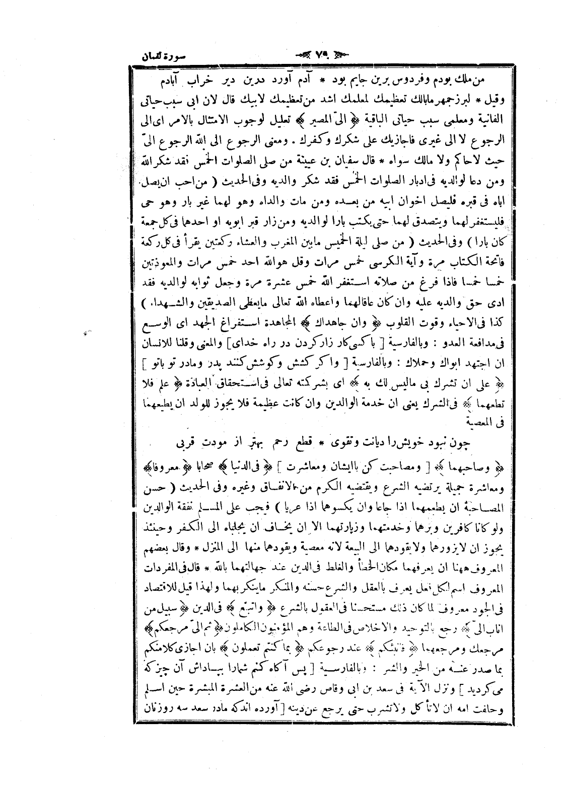 وقيل لبرزجمهر ما بالك تعظيمك لمعلمك أشد من تعظيمك لابيك قال لان ابى سبب حياتى الفانية ومعلمى سبب حياتى الباقية إِلَيَّ الْمَصِيرُ تعليل لوجوب الامتثال بالأمر اى الى الرجوع لا الى غيرى فاجازيك على شكرك وكفرك. ومعنى الرجوع الى الله الرجوع الىّ حيث لا حاكم ولا مالك سواه قال سفيان بن عيينة من صلى الصلوات الخمس فقد شكر الله ومن دعا لوالديه فى ادبار الصلوات الخمس فقد شكر والديه وفى الحديث (من أحب ان يصل أباه فى قبره فليصل اخوان أبيه من بعده ومن مات والداه وهو لهما غير بار وهو حى فليستغفر لهما ويتصدق لهما حتى يكتب بارا لوالديه ومن زار قبر أبويه او أحدهما فى كل جمعة كان بارا) وفى الحديث (من صلى ليلة الخميس ما بين المغرب والعشاء ركعتين يقرأ فى كل ركعة فاتحة الكتاب مرة وآية الكرسي خمس مرات وقل هو الله أحد خمس مرات والمعوذتين خمسا خمسا فاذا فرغ من صلاته استغفر الله خمس عشرة مرة وجعل ثوابه لوالديه فقد ادى حق والديه عليه وان كان عاقا لهما وأعطاه الله تعالى ما يعطى الصديقين والشهداء) كذا فى الاحياء وقوت القلوب وَإِنْ جاهَداكَ المجاهدة استفراغ الجهد اى الوسع فى مدافعة العدو: وبالفارسية [با كسى كارزار كردن در راه خداى] والمعنى وقلنا للانسان ان اجتهد أبواك وحملاك: وبالفارسية [واگر كشش وكوشش كنند پدر ومادر تو با تو] عَلى أَنْ تُشْرِكَ بِي ما لَيْسَ لَكَ بِهِ اى بشركته تعالى فى استحقاق العبادة عِلْمٌ فَلا تُطِعْهُما فى الشرك يعنى ان خدمة الوالدين وان كانت عظيمة فلا يجوز للولد ان يطيعهما فى المعصية