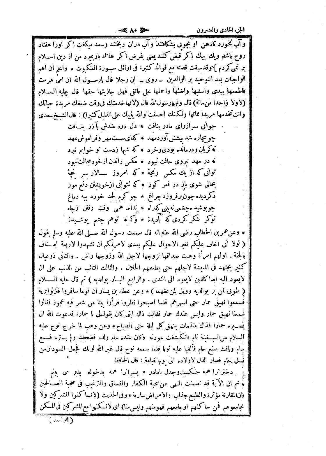 وآب نخورد تا دهن او بچوبى بشكافتند وآب دران ريختند وسعد ميكفت اگر او را هفتاد روح باشد ويك بيك اگر قبض كنند يعنى بفرض اگر هفتاد بار بميرد من از دين اسلام برنمى كردم] وقد سبقت قصته مع فوائد كثيرة فى أوائل سورة العنكبوت واعلم ان أهم الواجبات بعد التوحيد بر الوالدين- روى- ان رجلا قال يا رسول الله ان أمي هرمت فاطعمها بيدي وأسقيها وأوضيها واحملها على عاتقى فهل جازيتها حقها قال عليه السلام (لا ولا واحدا من مائة) قال ولم يا رسول الله قال (لانها خدمتك فى وقت ضعفك مريدة حياتك وأنت تخدمها مريدا مماتها ولكنك أحسنت والله يثيبك على القليل كثيرا) : قال الشيخ سعدى