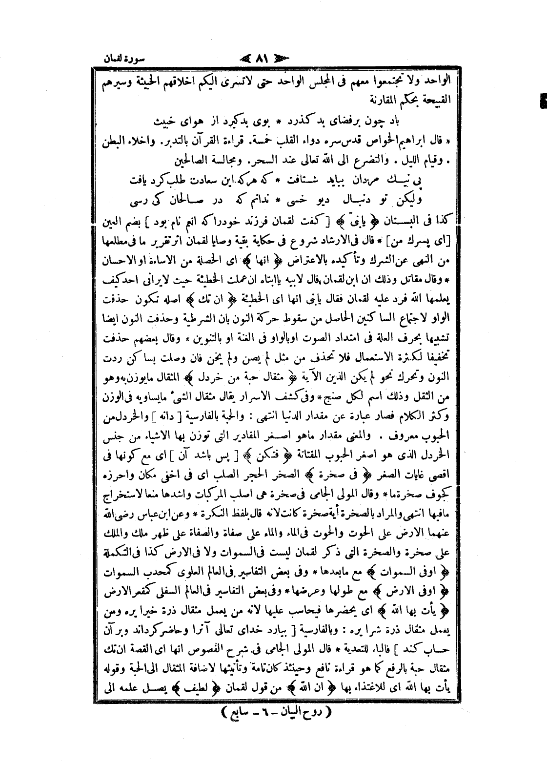 كذا فى البستان يا بُنَيَّ [كفت لقمان فرزند خود را كه أنعم نام بود] بضم العين [اى پسرك من] قال فى الإرشاد شروع فى حكاية بقية وصايا لقمان اثر تقرير ما فى مطلعها من النهى عن الشرك وتأكيده بالاعتراض إِنَّها اى الخصلة من الاساءة او الإحسان وقال مقاتل وذلك ان ابن لقمان قال لابيه يا أبتاه ان عملت الخطيئة حيث لا يرانى أحد كيف يعلمها الله فرد عليه لقمان فقال يا بنى انها اى الخطيئة إِنْ تَكُ أصله تكون حذفت الواو لاجتماع الساكنين الحاصل من سقوط حركة النون بان الشرطية وحذفت النون ايضا تشبيها بحرف العلة فى امتداد الصوت او بالواو فى الغنة او بالتنوين وقال بعضهم حذفت تخفيفا لكثرة الاستعمال فلا تحذف من مثل لم يصن ولم يخن فان وصلت بساكن ردت النون وتحرك نحو لم يكن الذين الآية مِثْقالَ حَبَّةٍ مِنْ خَرْدَلٍ المثقال ما يوزن به وهو من الثقل وذلك اسم لكل صنج وفى كشف الاسرار يقال مثقال الشيء ما يساويه فى الوزن وكثر الكلام فصار عبارة عن مقدار الدنيا انتهى: والحبة بالفارسية [دانه] والخردل من الحبوب معروف. والمعنى مقدار ما هو أصغر المقادير التي توزن بها الأشياء من جنس الخردل الذي هو أصغر الحبوب المقتاتة فَتَكُنْ [پس باشد آن] اى مع كونها فى أقصى غايات الصغر فِي صَخْرَةٍ الصخر الحجر الصلب اى فى أخفى مكان واحرزه كجوف صخرة ما وقال المولى الجامى فى صخرة هى أصلب المركبات وأشدها منعا لاستخراج ما فيها انتهى والمراد بالصخرة أية صخرة كانت لانه قال بلفظ النكرة وعن ابن عباس رضى الله عنهما الأرض على الحوت والحوت فى الماء والماء على صفاة والصفاة على ظهر ملك والملك على صخرة والصخرة التي ذكر لقمان ليست فى السموات ولا فى الأرض كذا فى التكملة أَوْ فِي السَّماواتِ مع ما بعدها وفى بعض التفاسير فى العالم العلوي كمحدب السموات أَوْ فِي الْأَرْضِ مع طولها وعرضها وفى بعض التفاسير فى العالم السفلى كمقعر الأرض يَأْتِ بِهَا اللَّهُ اى يحضرها فيحاسب عليها لانه من يعمل مثقال ذرة خيرا يره ومن يعمل مثقال ذرة شرا يره: وبالفارسية [بيارد خداى تعالى آنرا وحاضر كرداند وبر آن حساب كند] فالباء للتعدية قال المولى الجامى فى شرح الفصوص انها اى القصة ان تك مثقال حبة بالرفع كما هو قراءة نافع وحينئذ كان تامة وتأنيثها لاضافة المثقال الى الحبة وقوله يأت بها الله اى للاغتذاء بها إِنَّ اللَّهَ من قول لقمان لَطِيفٌ يصل علمه الى