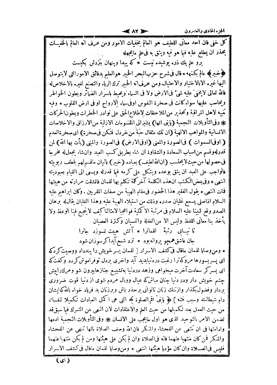 ومن وصايا لقمان ما قال فى كشف الاسرار [لقمان پسر خويش را پند داد ووصيت كرد كه اى پسر بسورها مرو كه ترا رغبت در دنيا پديد آيد واخرى بر دل تو فراموش كردد وكفت كه اى پسر بسورها مرو كه ترا رغبت در دنيا پديد آيد واخرى بر دل تو فراموش كردد وكفت كه اى پسر كر سعادت آخرت ميخواهى وزهد در دنيا به تشييع جنازها بيرون شو ومرك را پيش چشم خويش دار ودر دنيا چنان مباش كه عيال ووبال مردم شوى از دنيا قوت ضرورى بردار وفضول بگذار واز ننك زنان تا توانى بر حذر باش وبر زنان بد فرياد خواه بالله كه ايشان دام شيطانند وسبب فتنه] يا بُنَيَّ أَقِمِ الصَّلاةَ التي هى أكمل العبادات تكميلا لنفسك من حيث العمل بعد تكميلها من حيث العلم والاعتقادات لان النهى عن الشرك فيما سبق قد تضمن الأمر بالتوحيد الذي هو أول ما يجب على الإنسان وفى التأويلات النجمية ادمها وادامتها فى ان تنتهى عن الفحشاء والمنكر فان الله وصف الصلاة بانها تنهى عن الفحشاء والمنكر فمن كان منتهيا عنهما فانه فى الصلاة وان لم يكن على هيئتها ومن لم يكن منتهيا عنهما فليس فى الصلاة وان كان مؤديا هيئتها انتهى ومن وصايا لقمان ما قال فى كشف الاسرار
