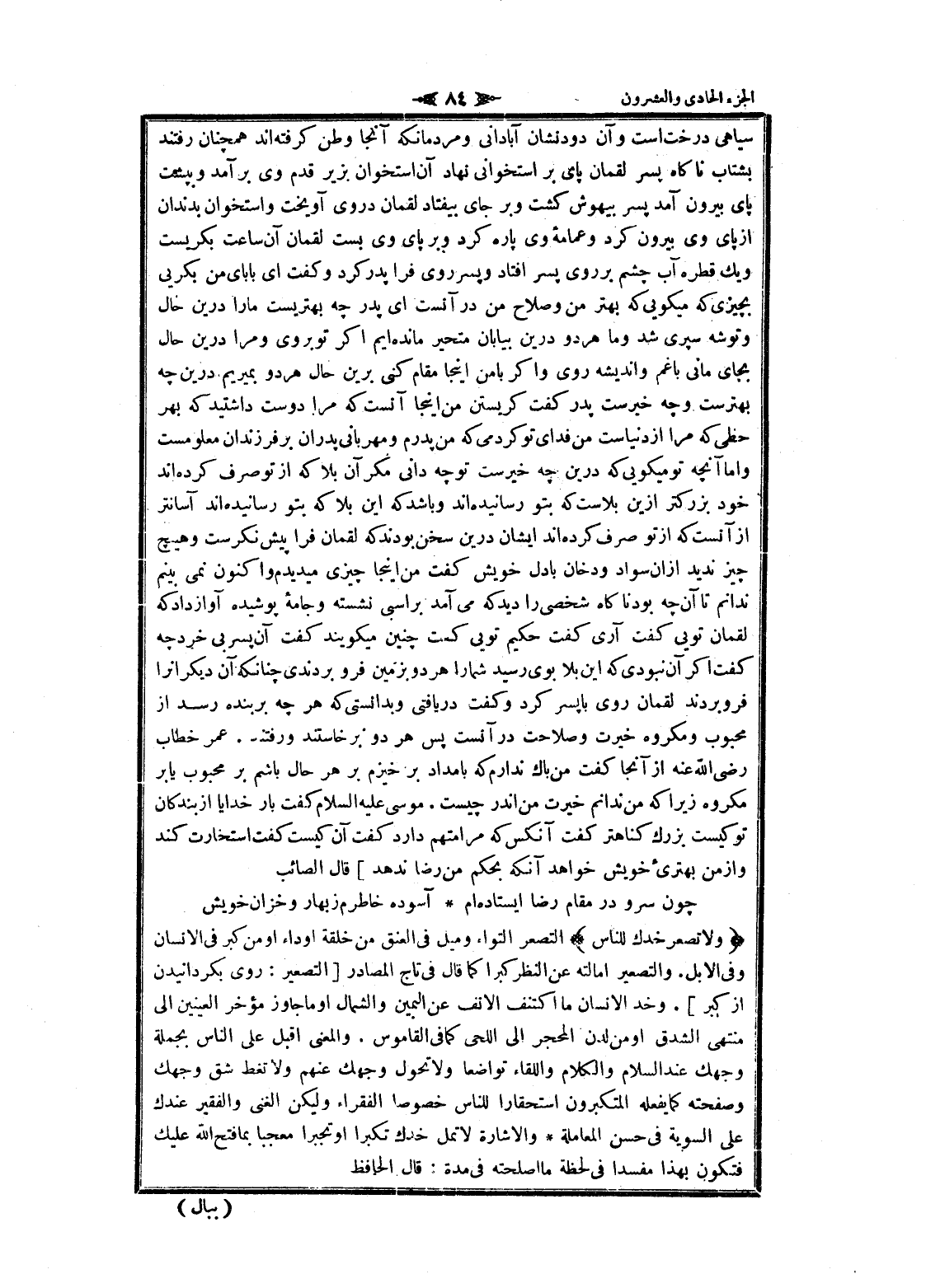سياهى درخت است وآن دود نشان آبادانى ومردمانكه آنجا وطن كرفته اند همچنان رفتند بشتاب ناكاه پسر لقمان پاى بر استخوانى نهاد آن استخوان بزير قدم وى برآمد وبپشت پاى بيرون آمد پسر بيهوش كشت وبر جاى بيفتاد لقمان در وى آويخت واستخوان بدندان از پاى وى بيرون كرد وعمامه وى پاره كرد وبر پاى وى بست لقمان آن ساعت بگريست ويك قطره آب چشم بر روى پسر افتاد و پسر روى فرا پدر كرد وكفت اى باباى من بگريى بچيزى كه ميكويى كه بهتر من وصلاح من در آنست اى پدر چهـ بهتريست ما را درين حال وتوشه سپرى شد وما هر دو درين بيابان متحير مانده ايم اگر تو بروى ومرا درين حال بجاى مانى با غم وانديشه روى واگر با من اينجا مقام كنى برين حال هر دو بميريم درين چهـ بهترست و چهـ خيرست پدر كفت كريستن من اينجا آنست كه مرا دوست داشتيد كه بهر حظى كه مرا از دنياست من فداى تو كردمى كه من پدرم ومهربانى پدران بر فرزندان معلومست واما آنچهـ تو ميكويى كه درين چهـ خيرست تو چهـ دانى مكر آن بلا كه از تو صرف كرده اند خود بزركتر ازين بلاست كه بتو رسانيده اند وباشد كه اين بلا كه بتو رسانيده اند آسانتر از آنست كه از تو صرف كرده اند ايشان درين سخن بودند كه لقمان فرا پيش نكرست وهيچ چيز نديد از ان سواد ودخان با دل خويش كفت من اينجا چيزى ميديدم واكنون نمى بينم ندانم تا آن چهـ بود ناكاه شخصى را ديد كه مى آمد بر اسبى نشسته وجامه پوشيده آواز داد كه لقمان تويى كفت آرى كفت حكيم تويى كفت چنين ميكويند كفت آن پسر بى خرد چهـ كفت اگر آن نبودى كه اين بلا بوى رسيد شما را هر دو بزمين فرو بردندى چنانكه آن ديكر انرا فرو بردند لقمان روى با پسر كرد وكفت دريافتى وبدانستى كه هر چهـ بر بنده رسد از محبوب ومكروه خيرت وصلاحت در آنست پس هر دو برخاستند ورفتند. عمر خطاب رضى الله عنه از آنجا كفت من باك ندارم كه بامداد برخيزم بر هر حال باشم بر محبوب يا بر مكروه زيرا كه من ندانم خيرت من اندر چيست. موسى عليه السلام كفت بار خدايا از بندگان تو كيست بزرك كناهتر كفت آنكس كه مرا متهم دارد كفت آن كيست كفت استخارت كند واز من بهترىء خويش خواهد آنكه بحكم من رضا ندهد] قال الصائب