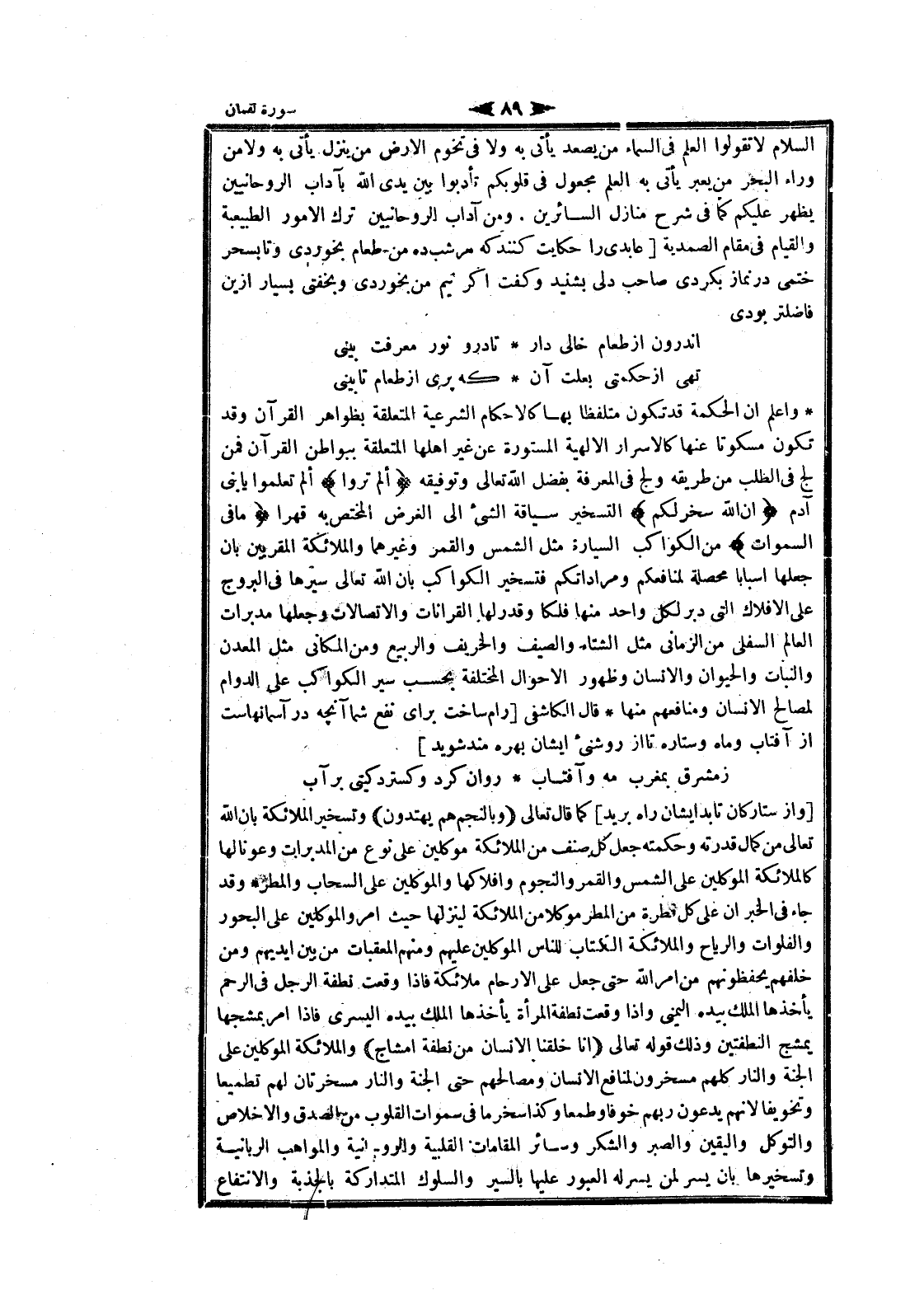 واعلم ان الحكمة قد تكون متلفظا بها كالاحكام الشرعية المتعلقة بظواهر القرآن وقد تكون مسكوتا عنها كالاسرار الالهية المستورة عن غير أهلها المتعلقة ببواطن القرآن فمن لج فى الطلب من طريقه ولج فى المعرفة بفضل الله تعالى وتوفيقه أَلَمْ تَرَوْا ألم تعلموا يا بنى آدم أَنَّ اللَّهَ سَخَّرَ لَكُمْ التسخير سياقة الشيء الى الغرض المختص به قهرا ما فِي السَّماواتِ من الكواكب السيارة مثل الشمس والقمر وغيرهما والملائكة المقربين بان جعلها أسبابا محصلة لمنافعكم ومراداتكم فتسخير الكواكب بان الله تعالى سيرها فى البروج على الافلاك التي دبر لكل واحد منها فلكا وقدر لها القرانات والاتصالات وجعلها مدبرات العالم السفلى من الزمانى مثل الشتاء والصيف والخريف والربيع ومن المكاني مثل المعدن والنبات والحيوان والإنسان وظهور الأحوال المختلفة بحسب سير الكواكب على الدوام لمصالح الإنسان ومنافعهم منها قال الكاشفى [رام ساخت براى نفع شما آنچهـ در آسمانهاست از آفتاب وماه وستاره تا از روشنىء ايشان بهره مند شويد]