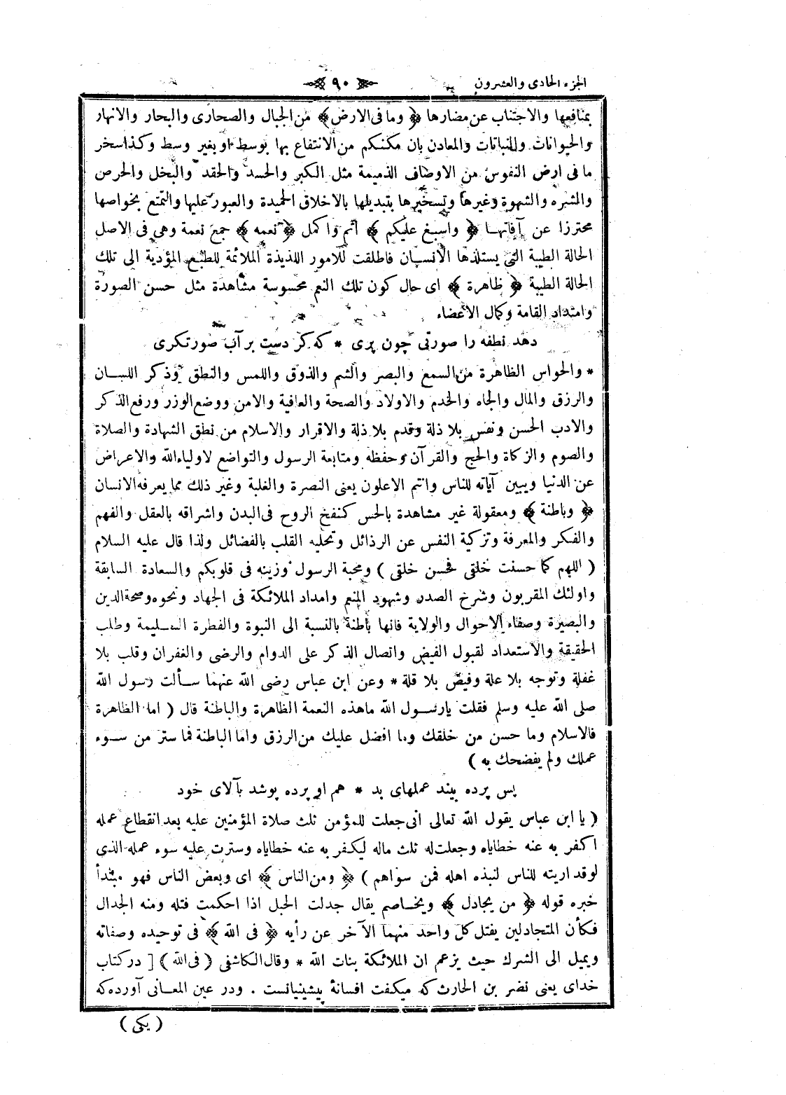 والولاية فانها باطنة بالنسبة الى النبوة والفطرة السليمة وطلب الحقيقة والاستعداد لقبول الفيض واتصال الذكر على الدوام والرضى والغفران وقلب بلا غفلة وتوجه بلا علة وفيض بلا قلة. وعن ابن عباس رضى الله عنهما سألت رسول الله صلى الله عليه وسلم فقلت يا رسول الله ما هذه النعمة الظاهرة والباطنة قال (اما الظاهرة فالاسلام وما حسن من خلقك وما أفضل عليك من الرزق واما الباطنة فما ستر من سوء عملك ولم يفضحك به)