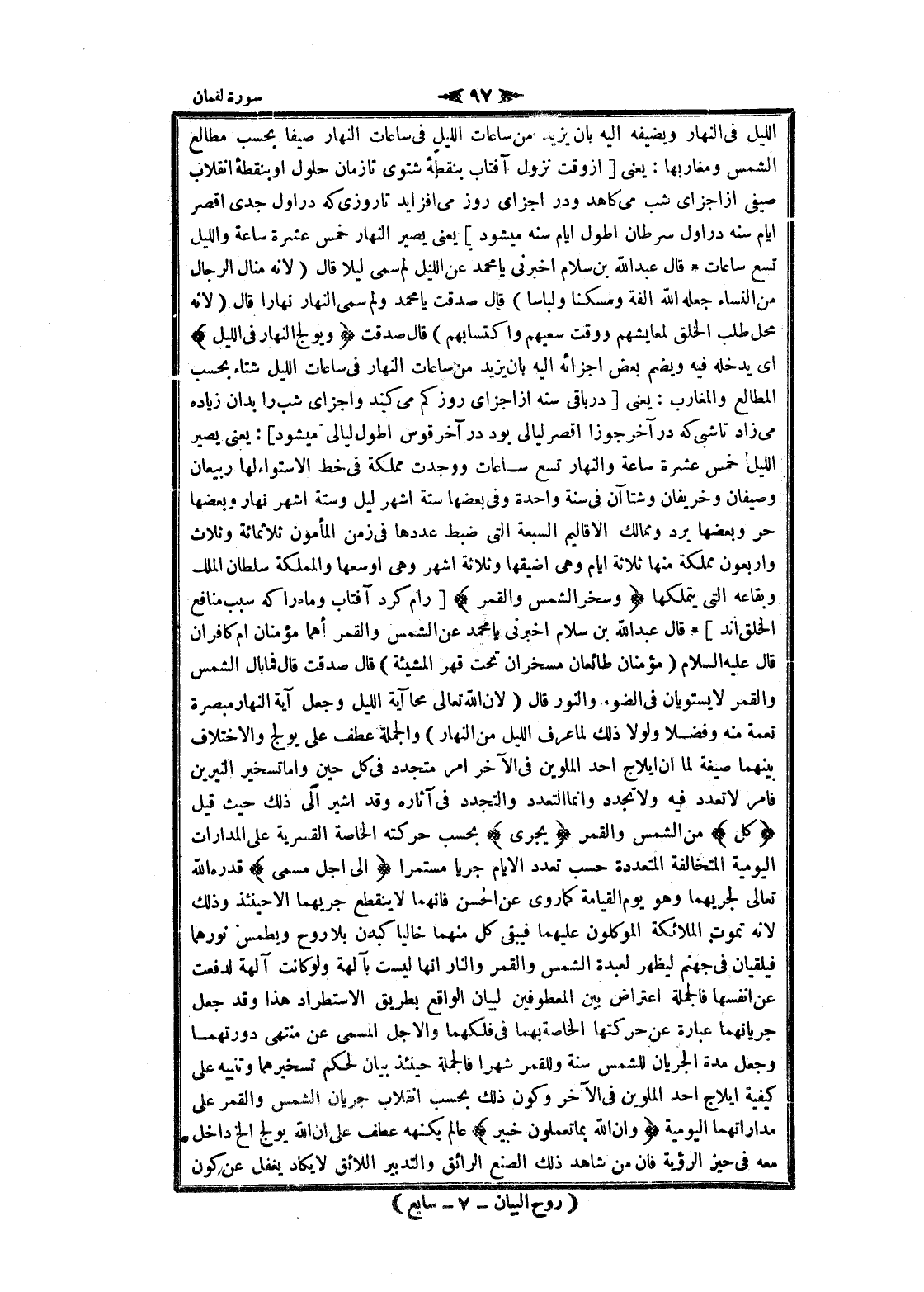 الليل فى النهار ويضيفه اليه بان يزيد من ساعات الليل فى ساعات النهار صيفا بحسب مطالع الشمس ومغاربها: يعنى [از وقت نزول آفتاب بنقطه شتوى تا زمان حلول او بنقطه انقلاب صيفى از اجزاى شب مى كاهد ودر اجزاى روز مى افزايد تا روزى كه در أول جدى اقصر ايام سنه در أول سرطان أطول ايام سنه ميشود] يعنى يصير النهار خمس عشرة ساعة والليل تسع ساعات قال عبد الله بن سلام أخبرني يا محمد عن الليل لم سمى ليلا قال (لانه منال الرجال من النساء جعله الله الفة ومسكنا ولباسا) قال صدقت يا محمد ولم سمى النهار نهارا قال (لانه محل طلب الخلق لمعايشهم ووقت سعيهم واكتسابهم) قال صدقت وَيُولِجُ النَّهارَ فِي اللَّيْلِ اى يدخله فيه ويضم بعض اجزائه اليه بان يزيد من ساعات النهار فى ساعات الليل شتاء بحسب المطالع والمغارب: يعنى [در باقى سنه از اجزاى روز كم مى كند واجزاى شب را بدان زياده مى زاد تا شبى كه در آخر جوزا اقصر ليالى بود در آخر قوس أطول ليالى ميشود] : يعنى يصير الليل خمس عشرة ساعة والنهار تسع ساعات ووجدت مملكة فى خط الاستواء لها ربيعان وصيفان وخريفان وشتا آن فى سنة واحدة وفى بعضها ستة أشهر ليل وستة أشهر نهار وبعضها حر وبعضها برد وممالك الأقاليم السبعة التي ضبط عددها فى زمن المأمون ثلاثمائة وثلاث وأربعون مملكة منها ثلاثة ايام وهى أضيقها وثلاثة أشهر وهى أوسعها والمملكة سلطان الملك وبقاعه التي يتملكها وَسَخَّرَ الشَّمْسَ وَالْقَمَرَ [رام كرد آفتاب وماه را كه سبب منافع الخلق اند] قال عبد الله بن سلام أخبرني يا محمد عن الشمس والقمر أهما مؤمنان أم كافران قال عليه السلام (مؤمنان طائعان مسخران تحت قهر المشيئة) قال صدقت قال فما بال الشمس والقمر لا يستويان فى الضوء والنور قال (لان الله تعالى محا آية الليل وجعل آية النهار مبصرة نعمة منه وفضلا ولولا ذلك لما عرف الليل من النهار) والجملة عطف على يولج والاختلاف بينهما صيغة لما ان إيلاج أحد الملوين فى الآخر امر متجدد فى كل حين واما تسخير النيرين فامر لا تعدد فيه ولا تجدد وانما التعدد والتجدد فى آثاره وقد أشير الى ذلك حيث قيل كُلٌّ من الشمس والقمر يَجْرِي بحسب حركته الخاصة القسرية على المدارات اليومية المتخالفة المتعددة حسب تعدد الأيام جريا مستمرا إِلى أَجَلٍ مُسَمًّى قدره الله تعالى لجريهما وهو يوم القيامة كما روى عن الحسن فانهما لا ينقطع جريهما الا حينئذ وذلك لانه تموت الملائكة الموكلون عليهما فيبقى كل منهما خاليا كبدن بلا روح ويطمس نورهما فيلقيان فى جهنم ليظهر لعبدة الشمس والقمر والنار انها ليست بآلهة