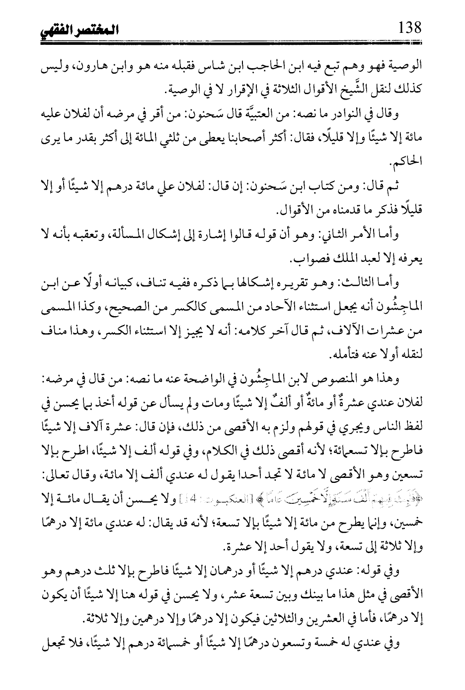 وهذا هو المنصوص لابن الماجشون في الواضحة عنه ما نصه: من قال في مرضه: لفلان عندي عشرة أو مائة أو ألف إلا شيئا ومات ولم يسأل عن قوله أخذ بما يحسن في لفظ الناس ويجري في قولهم ولزم به الأقصى من ذلك، فإن قال: عشرة آلاف إلا شيئا فاطرح بإلا تسعمائة؛ لأنه أقصى ذلك في الكلام، وفي قوله ألف إلا شيئا، اطرح بإلا تسعين وهو الأقصى لا مائة لا تجد أحدا يقول له عندي ألف إلا مائة، وقال تعالى: {فَلَبِثَ فِيهِمْ أَلْفَ سَنَةٍ إِلَّا خَمْسِينَ عَامًا} [العنكبوت: 14] ولا يحسن أن يقال مائة إلا خمسين، وإنما يطرح من مائة إلا شيئا بإلا تسعة؛ لأنه قد يقال: له عندي مائة إلا درهما وإلا ثلاثة إلى تسعة، ولا يقول أحد إلا عشرة.