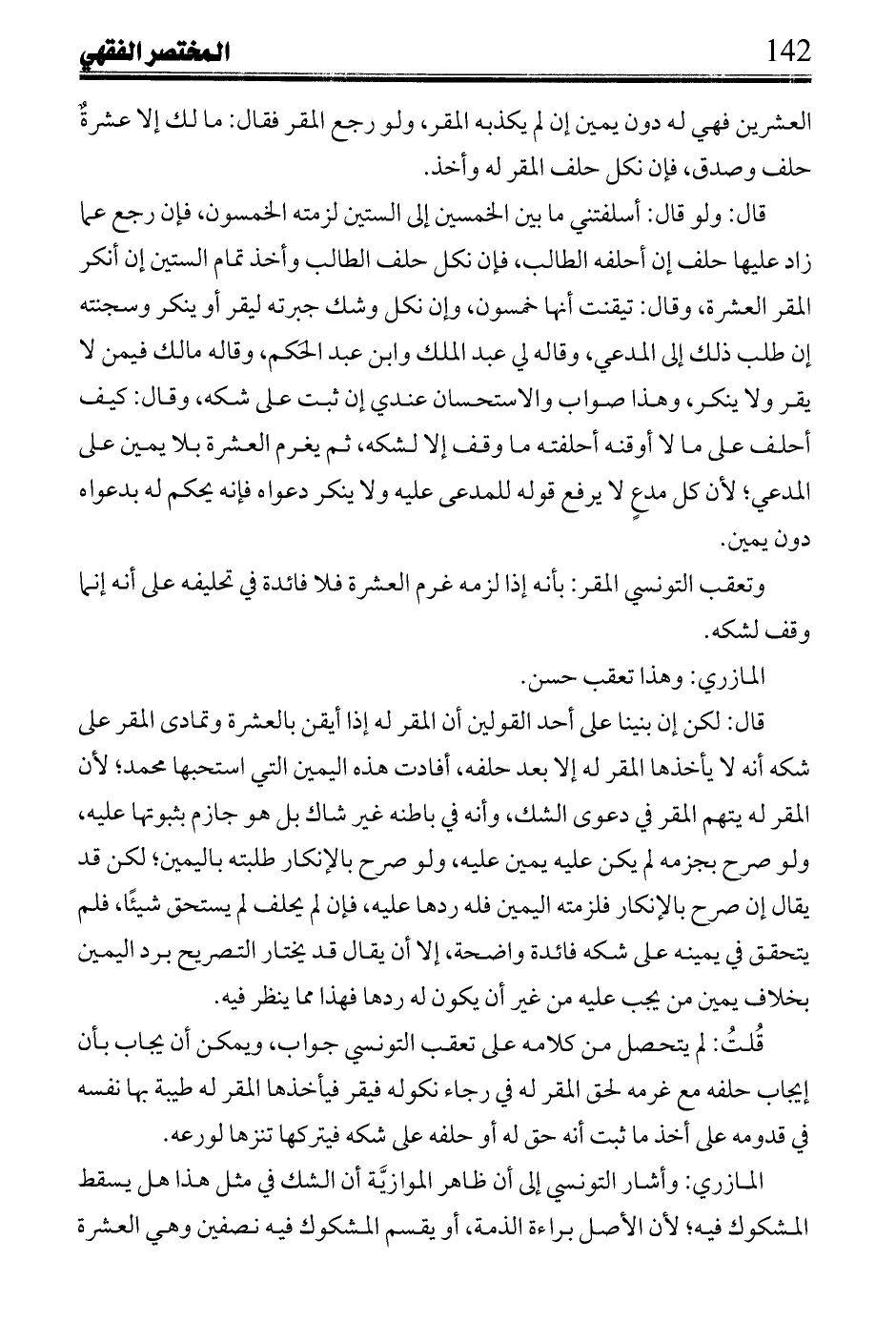 وتعقب التونسي المقر: بأنه إذا لزمه العشرة فلا فائدة في تحليفه على أنه إنما وقف لشكه.
