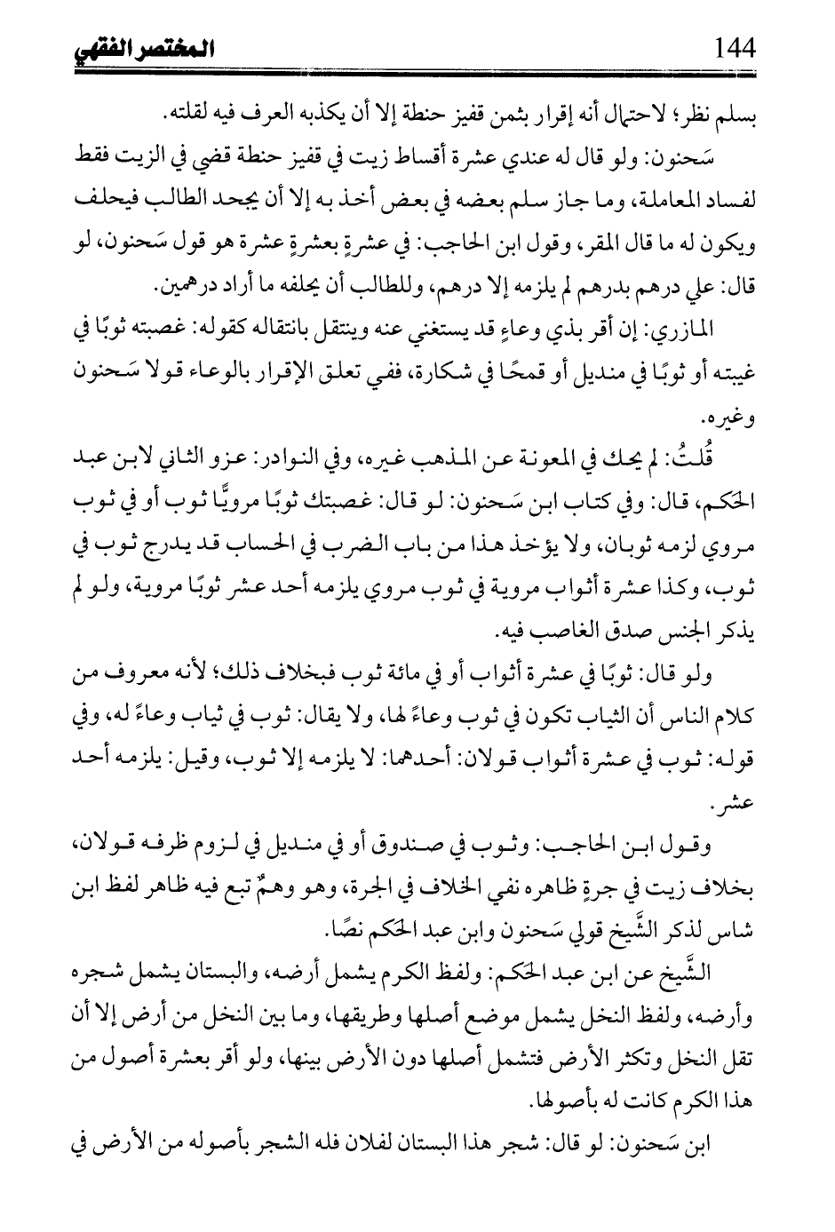 الشَّيخ عن ابن عبد الحكم: ولفظ الكرم يشمل أرضه، والبستان يشمل شجره وأرضه، ولفظ النخل يشمل موضع أصلها وطريقها، ومابين النخل من أرض إلا أن تقل النخل وتكثر الأرض فتشمل أصلها جون الأرض بينها، ولو أقر بعشرة أصول من هذا الكرم كانت له بأصولها.