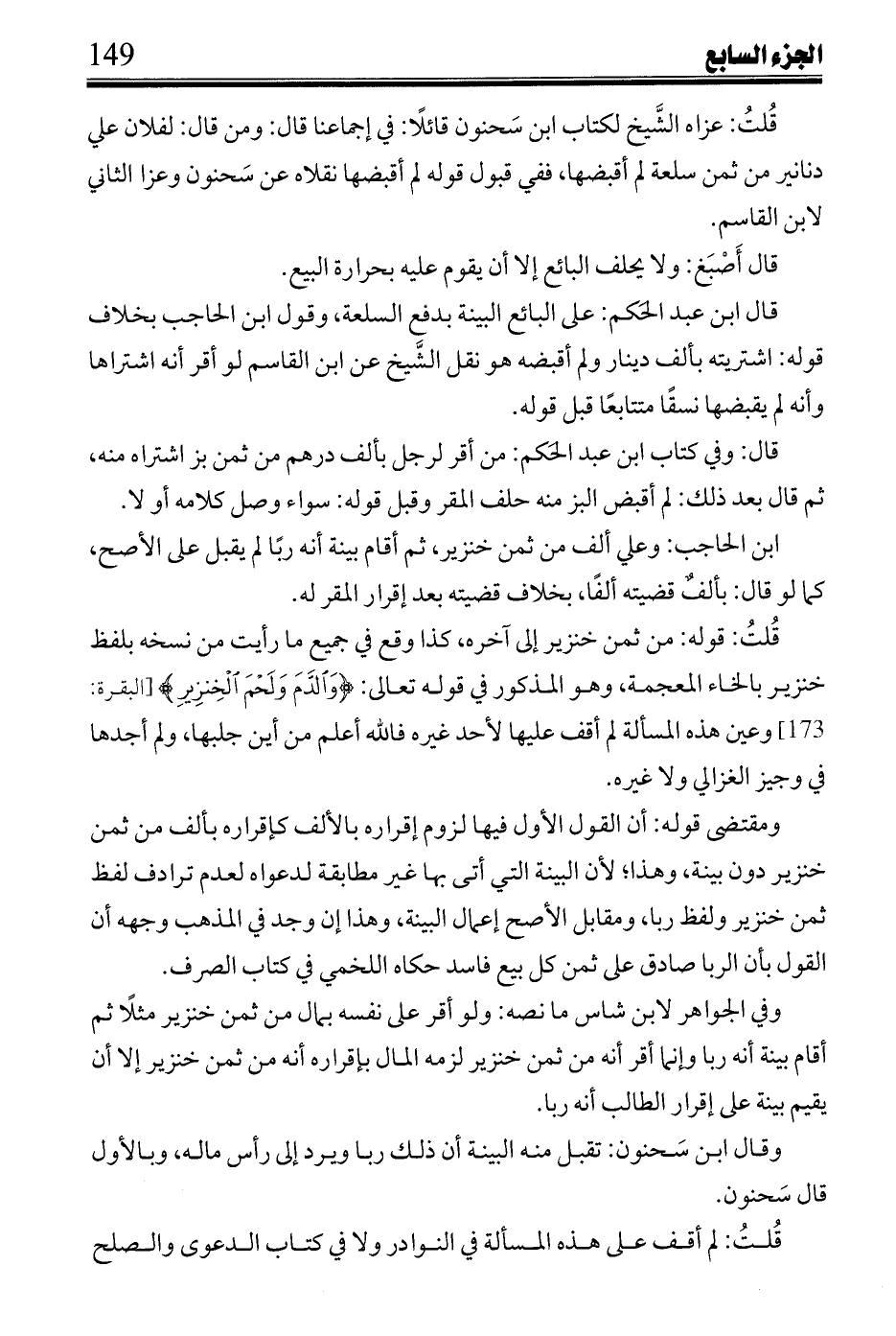 وفي الجواهر لابن شاس ما نصه: ولو أقر على نفسه بمال من ثمن خنزير مثلاً ثم اقام بينه ـأنه ربا وإنما أقر أنه من ثمن الخنزير لزمه المال بإقراره أنه من ثمن خنزير إلا أن يقيم بينه على إقرار الطالب أنه ربا.