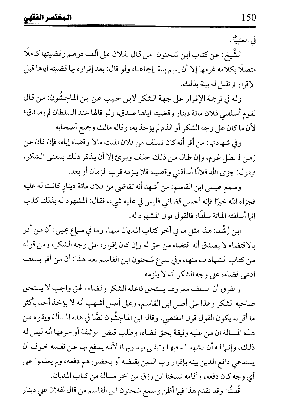 ابن رشد: هذا مثل مافي آخر كتاب المديان منها، مافي سماع يحيى، أن من أقر بالاقتضاء لا يصدق أنه اقتضاه من حق له وإن كان إقراره ع لى وجه الشكر، ومن قوله من كتاب الشهادات منها، وفي سماع سَحنون ابن القاسم بعد هذا: أن من اقر بسلف ادعى قضاءه على وجه الشكر أنه لا يلزمه.