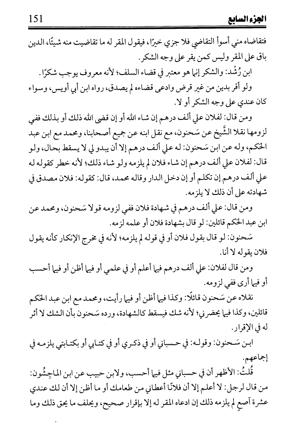 قُلتُ: الأظهر أن في حسباتي مثل فيما أحسب، ولابن جبيب عن ابن الجاجشِون من قال لرجل: لا أعلم إ لا أن فلاناً أعطاني من طعامك أو ما أظن إلا أن لك عندي عشرة أصع لم يلزمه ذلك إن اعاه المقر له إلا بإقرار صحيح، ويحلف مايحق ذلك وما