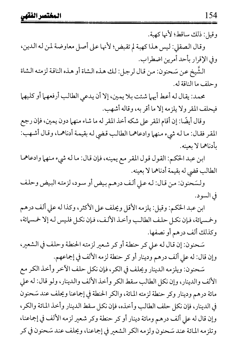 سَحنون: ويلزمه الدينار ويحلف في الكر، فإن نكل حلف الآخر وأخذ الكر مع الألف والدينار، ون نكل الطالب سقط الكر وأخذ الألف والجينا ولو قال: له علي مائة درهم وكر حنطة لزمته المائة، والكر الحنطة في إجماعنا ويحلف عند سَحنون في الدينار، فإن نكل حلف الطالب وأخذه، فإن نكل سقط الدينار وأخذ المائة والكر، وإن قال علي ألف درهم ومائة دينار أو كر حنطة وكر شعير لزمه الألف في إجماعنا، وتلزمه المائةعند سَحنون ولزمه الكر شعير في إجماعنا، ويحلف عند سَحنون في كر