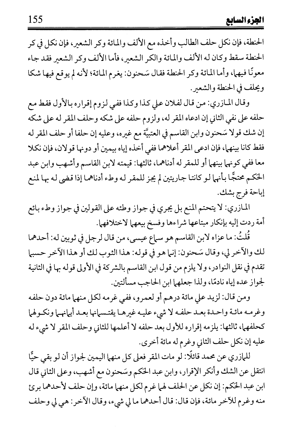 وقال المازري: من قال لفلان علي كذا وكذا ففي لزوم إقراره بالأول فقط مع حلفه على نفي الثاني إن ادعاه المقر له، ولزوم حلفه على شكه وحلف المقر له على شكه إن شك قولا سَحنون وابن القاسم في العتبية مع غيره، وعليه أن حلفا أو حلف المقر له فقط كانا بينهما، فإن ادعى المقر أعلاهما ففي أخذه إياه بيمين أو دونها قولان، فإن نكلا معا ففي كونهما بينهما أو للمقر له أدناهما، ثالثهما، قيمته لابن القاسم وأشهب وابن عبد الحكم محتجا بأنهما لو كانتا جاريتين لم يجيز للمقر له وطء أدناهما إذا قضى له بها لمنع إباحة فرج بشك.