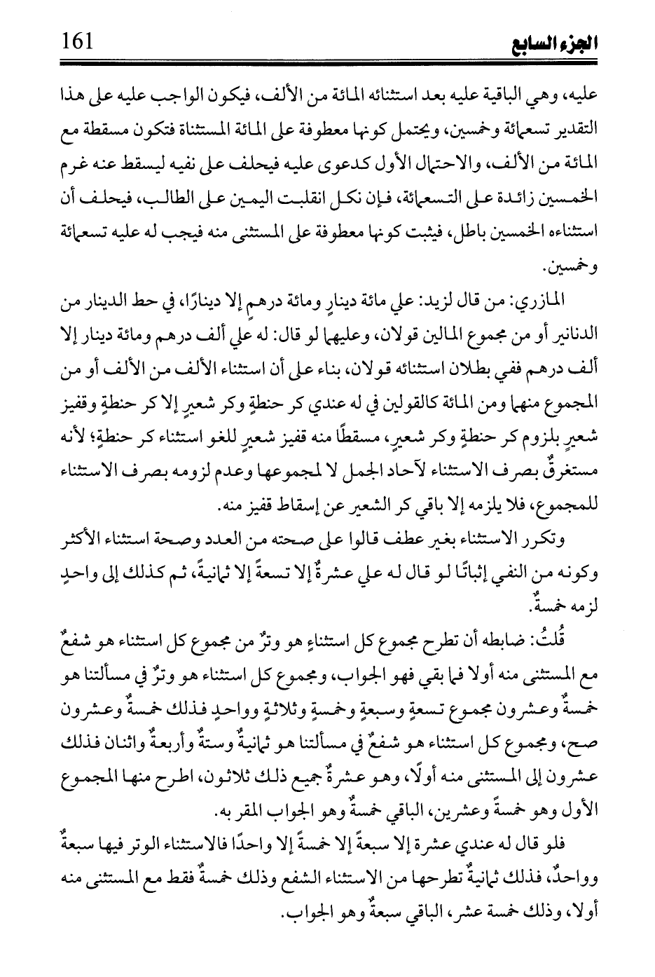 قُلتُ: ضابطه أن تطرح مجموع كل استثناءٍ هو وترٌ من مجموع كل استثناء هو شفعٌ مع المستثنى منه أولا فما بقي فهو الجواب، ومجموع كل استثناء هو وترٌ في مسألتنا هو خمسةٌ وعشرون مجموع تسعةٍ وخمسةٍ وثلاثةٍ وواحدٍ فذلك خمسةٌ وعشرون صح، ومجموع كل استثناء هو شفعٌ في مسألتنا هو ثمانيةٌ وستةٌ وأربعةٌ واثنان فذلك عشرون إلى المستثنى منه أولًا، وهو عشرةٌ جميع ذلك ثلاثون، اطرح منها المجموع الأول وهو خمسةً وعشرين، الباقي خمسةٌ وهو الجواب المقر به.
