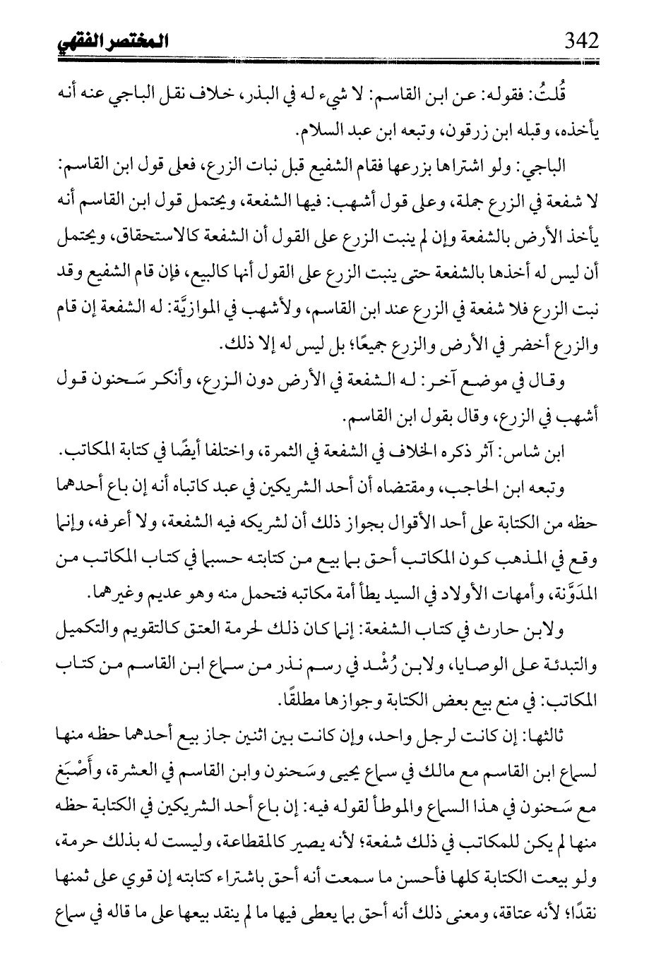 ابن رُشْد: إنما وقع اختلاف قول مالك في الشفعة في الكراء في الواضحة, وبقوله بالشفعة فيه قال ابن الماجِشُون وابن عبد الحَكم, وبنفيها فيه قال ابن القاسم ومُطَرَّف وأَصْبَغ وابن حبيب.