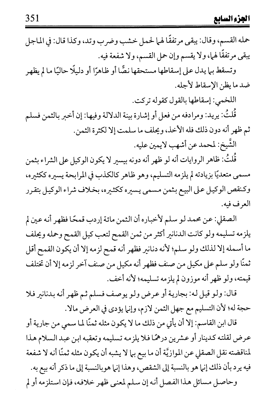قُلتُ: قوله يدل على إسقاطه على كل حال يرد بأنه إن أراد كل حال يتقرر فيما كون العرض ثمناً سلم ولا يتناول محل النزاع ضرورة كون العوض فيها لا يتقرر كونه ثمناً، وإن أراد مطلقاً منع ورده بمسألة المحاباة مع ما فيها من الاستثناء لا يتم؛ لأن المحاباة لا تنافي حقيقة البيع ونزارة العوض تنافيه.
