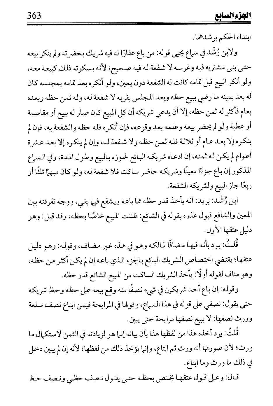 ابن رشد: إن وقفه الحاكم فقال: أخذت، وقال المشتري: سلمت، فأجل في الثمن فحل أجله وعجز عنه بيع عليه كل ماله في الثمن، ولا رد لواحد منهما في الأخذ والتسليم إلا بتراضيهما، وإن وقف فقال: أخذت، وسكت المشتري ولم يقل: سلمت، فأجله الحاكم في الثمن فلم يأت به إلى الأجل فللمشتري بيع مال الشفيع أو أخذ شقصه، وإن أراد الشفيع رد الشقص أو تماسكه به حتى يباع ما له في ثمنه لم يكن له في ذلك خيار، وهذا الوجه في "المدونة".