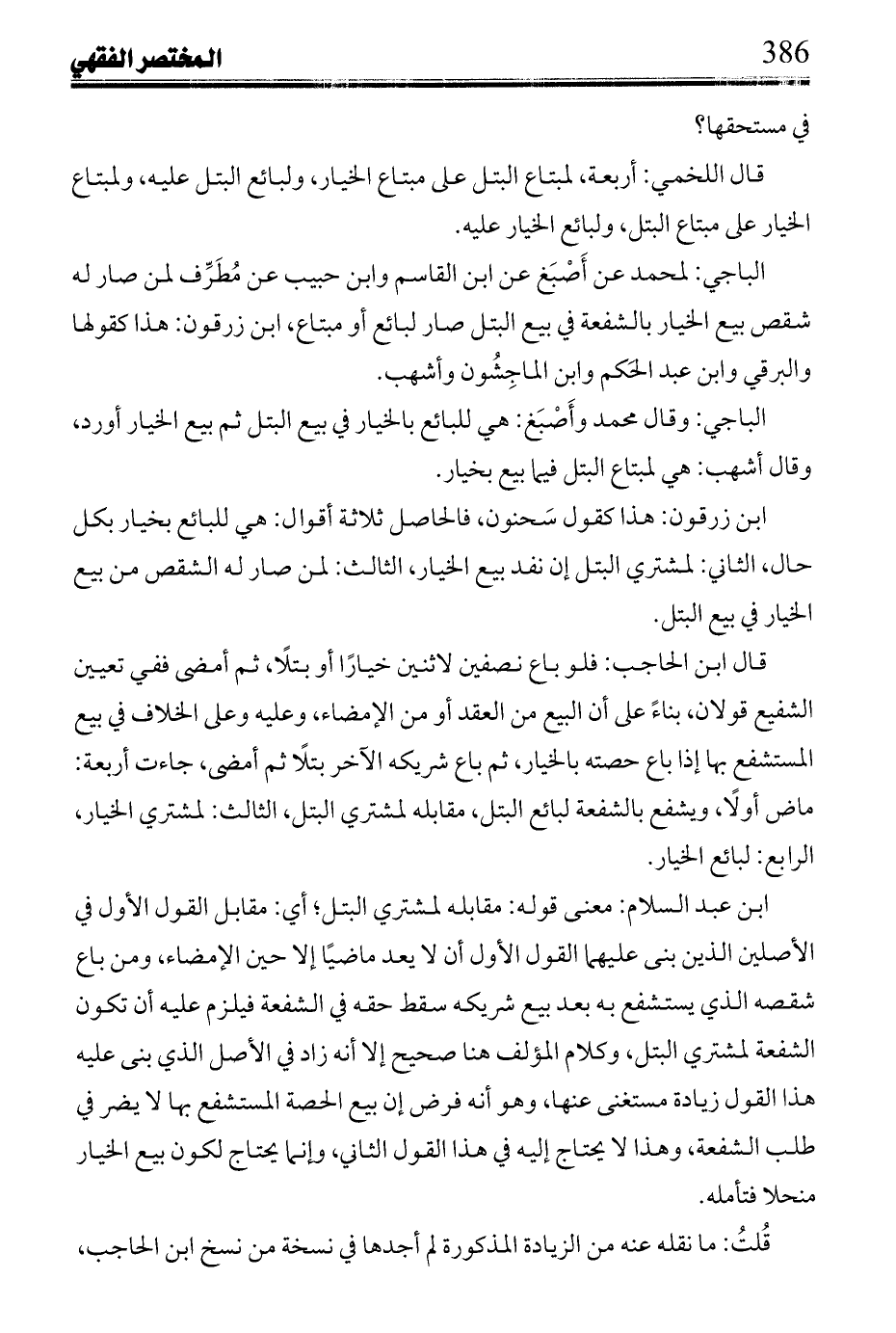 قُلتُ: فجعل له الشفعة بشقص غير مضمون؛ لأن المبيع على خيار ضمانه من بائعه فتأمله، ولأشهب: من ابتاع شقصًا فرده بعيب أو أراد رده فطلب شفيعه أخذه بعيبه فلا شفعة له، وقال سحنون فيه وفي استحقاق أكثره، وقال سحنون: إن أفلس مشتري الشقص فرجع إلى بائعه ففيه الشفعة؛ لأنه بيع جديد.