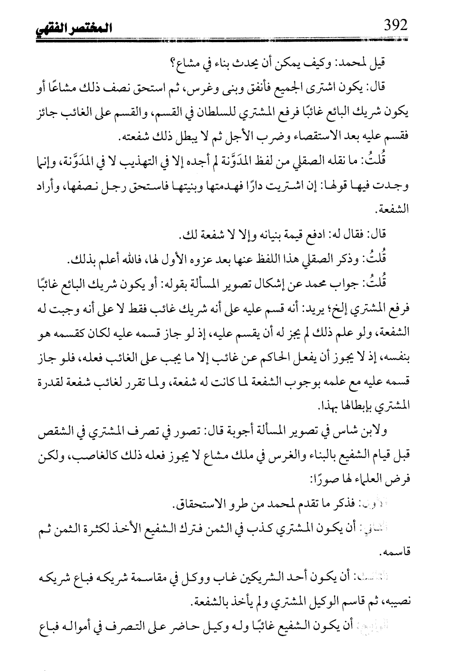 فقلت له: لا شفعة لهم عليك، فذكر لي أنه حكم بها عليه فذكرت المسألة والأخذ منها للقاضي ابن عبد السلام فرجع بإنصافه عن الحكم عليه بالشفعة لهم.