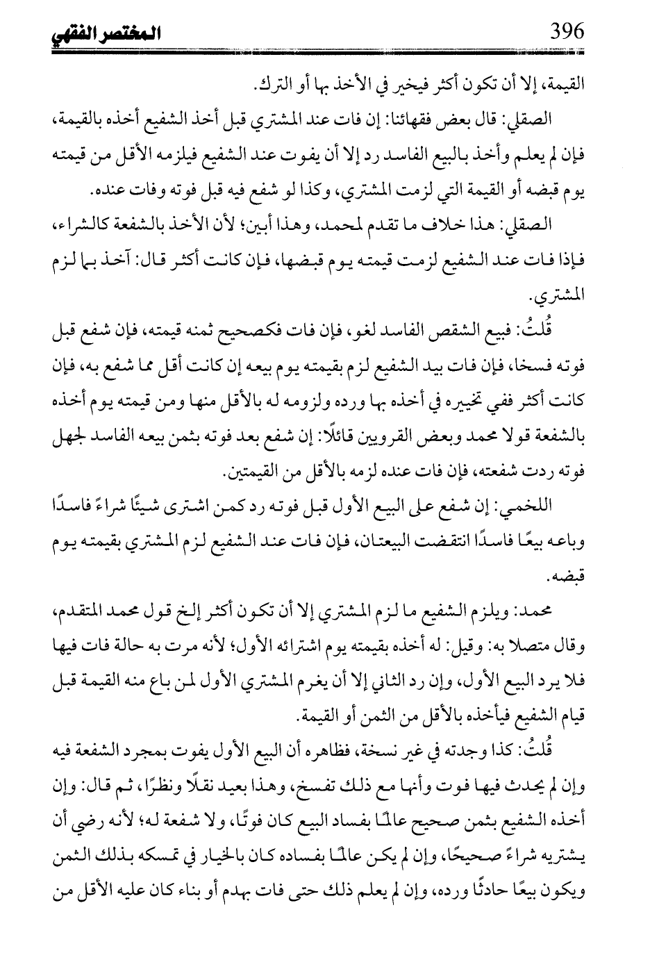وفيها مع غيرها: ما اشتري بعين أو مثلي فالشفعة فيه بمثل ثمنه، وما اشتري بمقوم قيمته فيها: ما اشتري بعبد شفع فيه بقيمته، وما اشتري بكراء إبل إلى مكة فمثل كرائها إلى مكة، وما اشتري بإجارة أجير سنة فقيمة الإجارة، وما اشتري بعرض فإنما ينظر إلى قيمته يوم الصفقة.