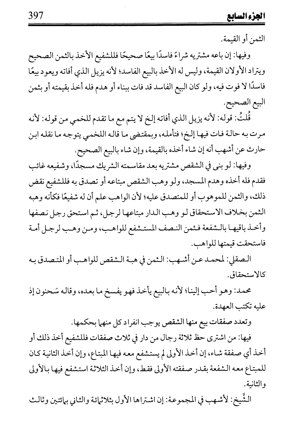 واستخفف محمد إ، كان الثمن طعامًا مسمى كيله دون صفته، وأجازه وإن وصف بعد ذلك فكان مثله أو دونه لزمه، وإن كان أعلى من الوسط خير في أخذه وتركه، وقول ابن عبد السلام في قول ابن الحاجب: فإن لم يتقوم كالمهر والخلع وصلح العمد ودراهم جزافًا بقيمة الشقص يوم العقد، وقيل: في المهر صداق المثل، وقيل: تبطل في الدراهم، هذا هو المشهور في هذه المسائل، يقتضي أن في الخلع ودم العمد خلافًا ولا أعرفه.