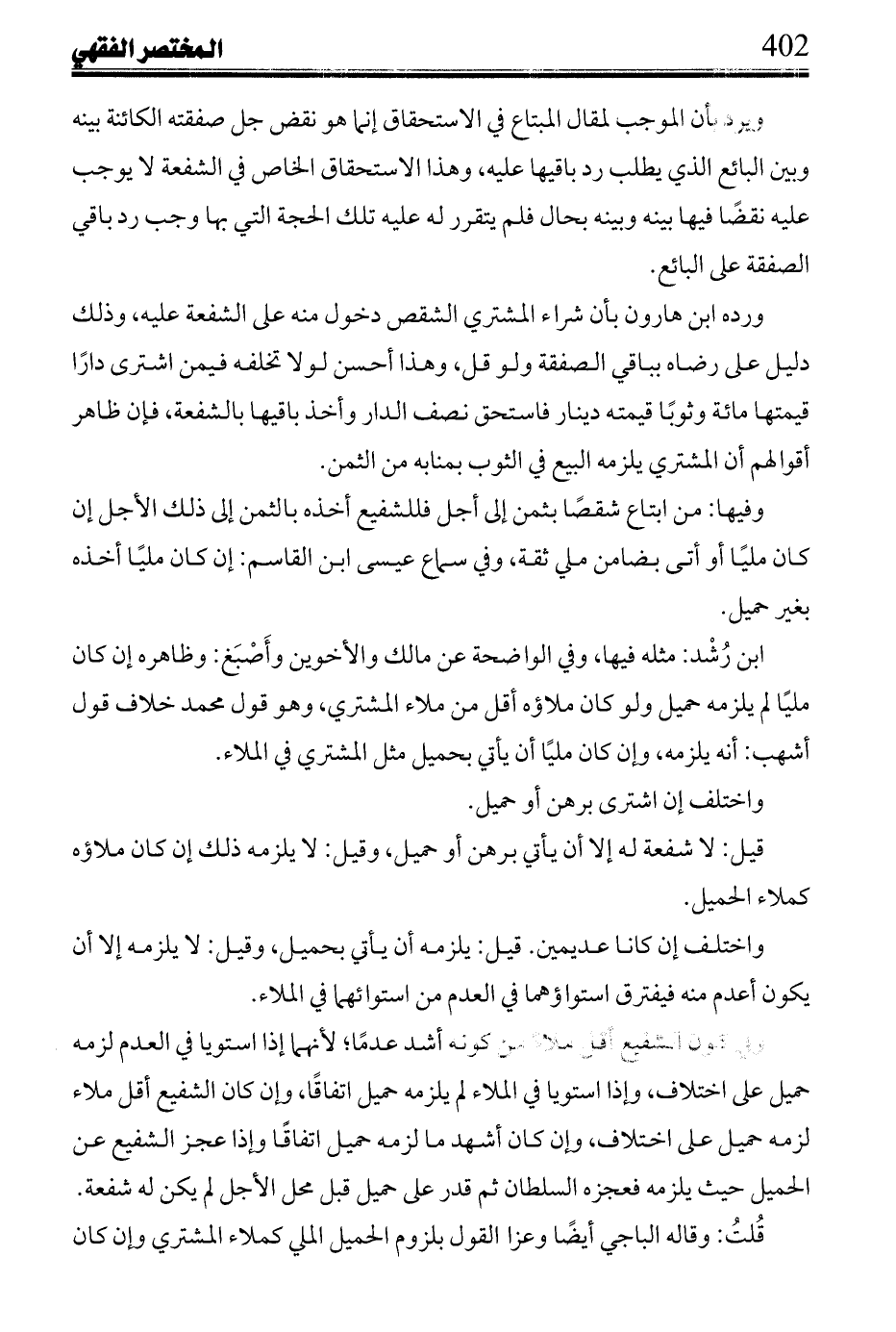ولابن رشد في سماع يحيى: لو كان الثمن خمرا أو خنزيرا؛ لأن البائع والمبتاع نصرانيان والشفيع مسلم، ففي كون الشفعة بقيمة الشقص أو بقيمة الخمر والخنزير قولا أشهب وابن عبد الحكم، والأول مقتضى قول ابن الماجشون في استهلاك المسلم خمر النصراني لا قيمة عليه، والثاني: أشبه بقول ابن القاسم: يغرم له قيمتها.
