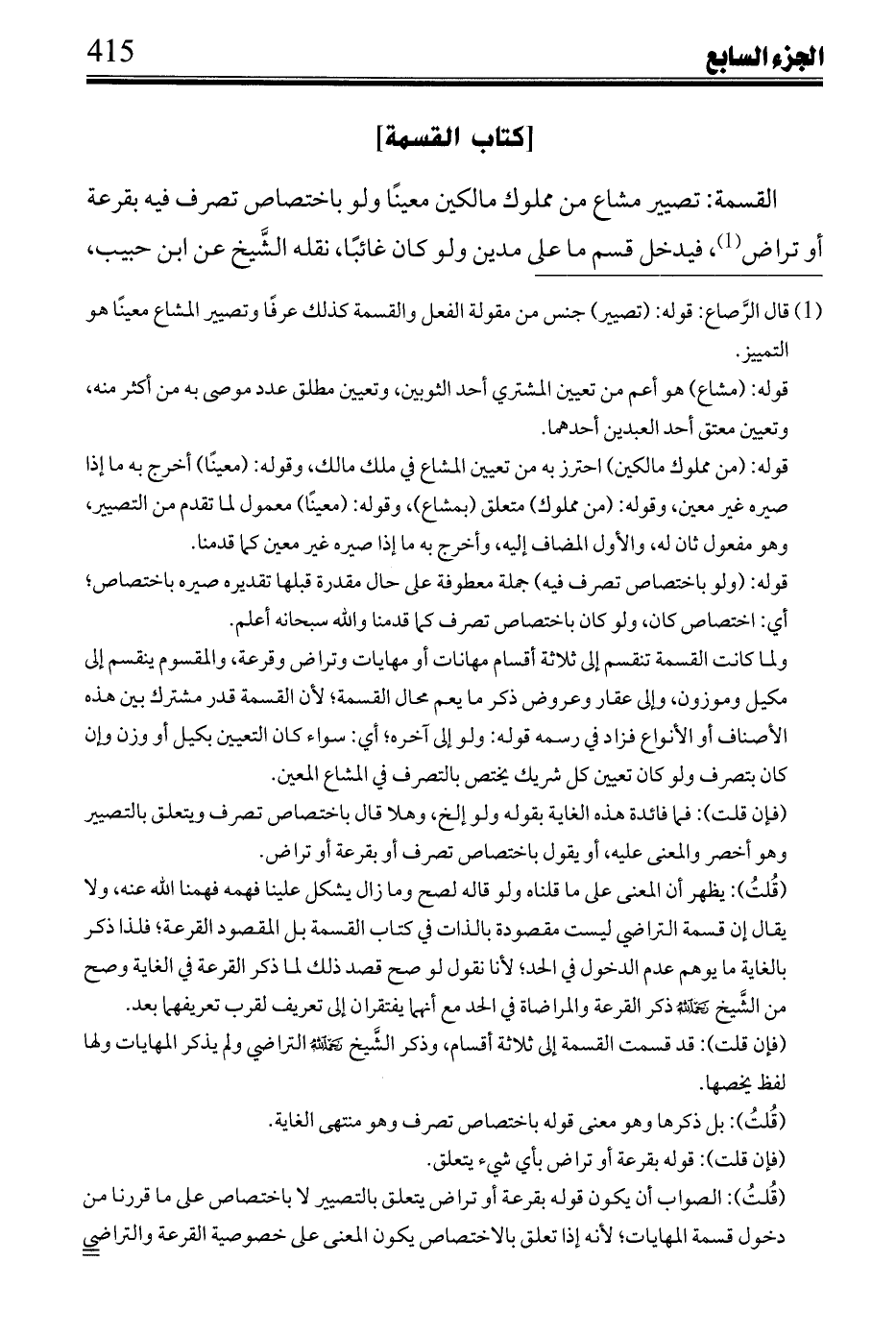 وتعريفها: الشيخ أبو العباس بأنها: اختصاص الشريك بما كان له مشاعا، يرد بأن اختصاص الشريك بالمشاع ثابت حال شركته خاصا بها أو عرضا عاما لها ولمقابلها، فهو مباين للقسمة أو أعم منها فيمنع تعريفها به، ودليل ثبوته حال الشركة قولها مع غيرها: إن باعت إحدى الزوجتين الوارثتين دارا حظها منها فالأخرى أحق بالشفعة فيه من سائر الورثة، فلولا اختصاصها بحظها مشاعا كانت أشفع، وإن عني بقوله: اختصاص الشريك؛ أن يتعين له ما كان مشاعا، ففيه عناية بغير لفظ معينها مع يسره، ويبطل طرد باختصاص موصي لها بعدد من أكثر منه المتقدم ذكره، واختصاص من تعدى عليه شريكه بما أتلف من المشترك بينهما المثلي قدر حظه المتعدي، كنقله قفيز حنطة بينهما في مفازة عر وأتلف قدر حظ الناقل منه.
