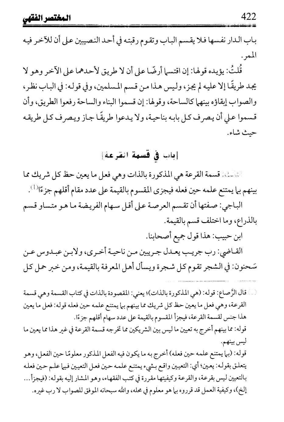 ونقل عياض عن ابن لبابة: لحضرة اعتبار التشاح بينهم في قسم الأجزاء من قبلة إلى جوف أو من شرق إلى غرب لاختلاف أغراضهم لجواز قرب ملك أحدهم لما