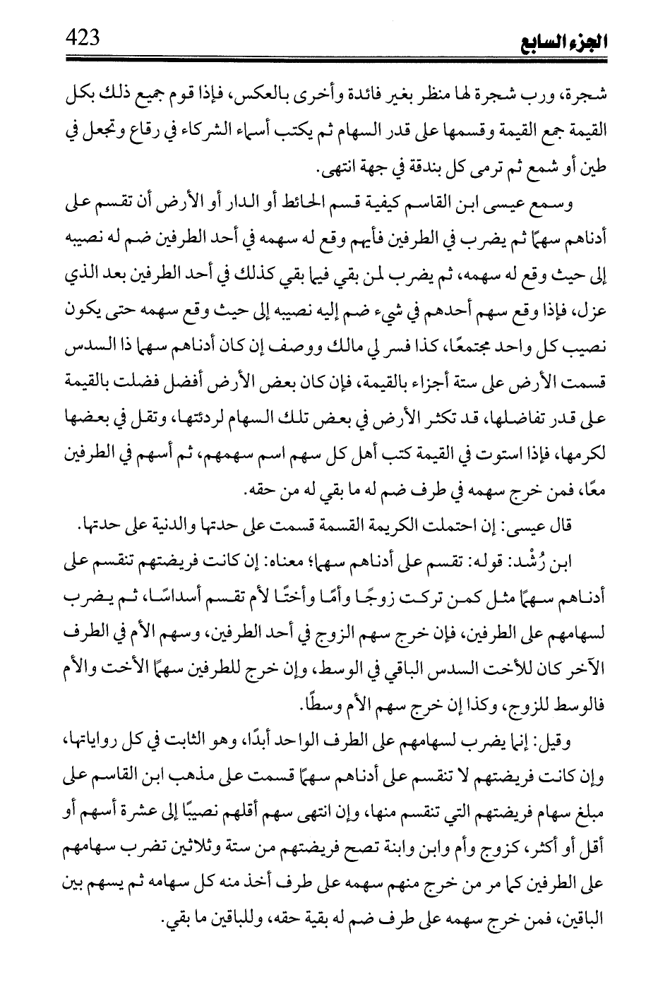 ابن رشد: هذا بين أن القسمة إلى ما تناهى إليه حظه بالمورث والشراء، وإن كان شيئا بعد شيء، وذلك بين ان انقسمت الدار على ما انتهى إليه حقه، وإن لم تنقسم على ما انتهى إليه حظه فيها، وتنقسم على ما كان له فيها أولا فيشبه أن يكون من حقه أن يقسم له حقه الأول منها إذا كان الزائد بميراث؛ لأنه يقول: وجبت لي القسمة فليس الميراث الذي وجب لي بمسقط حقي في القسمة، وأن لا يكون ذلك من حقه إن كان ذلك بشراء أو هبة بعدها.