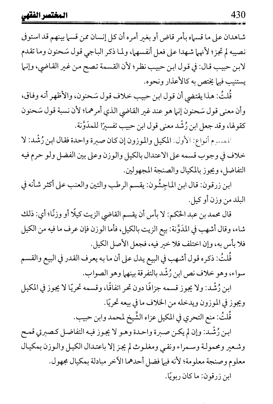 قلت: تقدم للباجي لحم الأضحية خلافه فتأمله، الثاني: العقار في جمع الدور في القسم بتقارب مواضعها أو يتساوى نفاقها، ثالثها: بهما للباجي عن أشهب وابن القاسم في المجموعة وسحنون قائلا: إن كانت إحداهما قاعة لم يجمعا، فإن كان بناء أحدهما أجود جمعا إن كانتا في نمط واحد فليست الدور كالأرضيين، وقد تكون الدور في نم