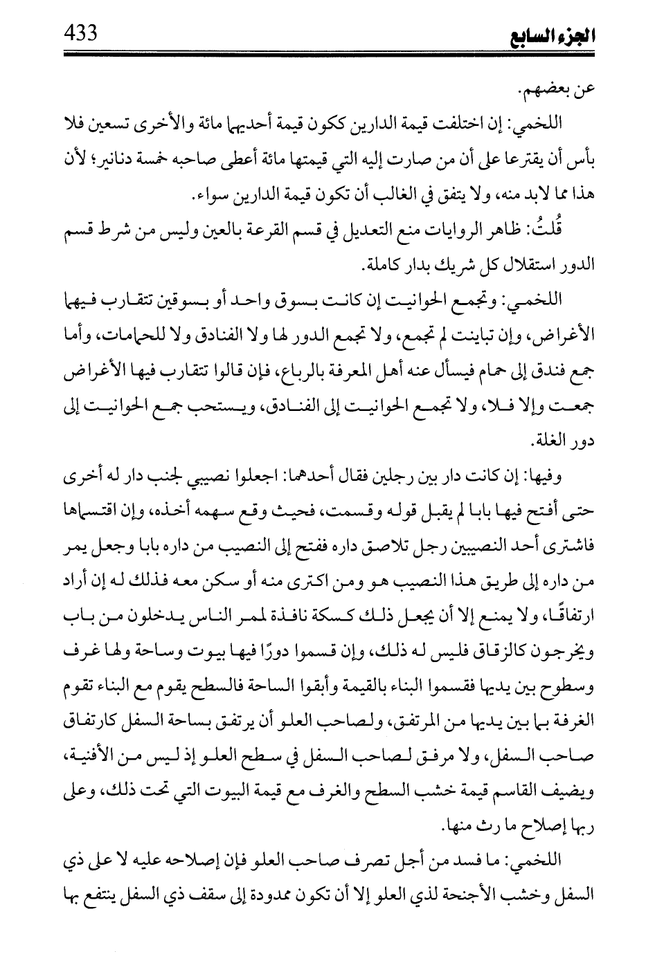 ابن رُشْد" الدار المشتركة بين اثنين فأكثر ولها ساحة إن كان يطير لكل ذي حظ من البيوت وساحتها ما ينتفع به ويستتر به عن صاحبه، ففي وجوب قسمها لمن طلبه ومنعه في ساحتها، ثالثها: إن لم يكن للبيوت حجر لمعروف المذهب وقول مطرف مع تأويله قول مالك عليه وسَحنون، وأخذ عياض الثاني من قولها في القسم إن كانوا قسموا البيوت والساحة قسماً واحداً تراضيا، ولم يذكر قول سحنون.