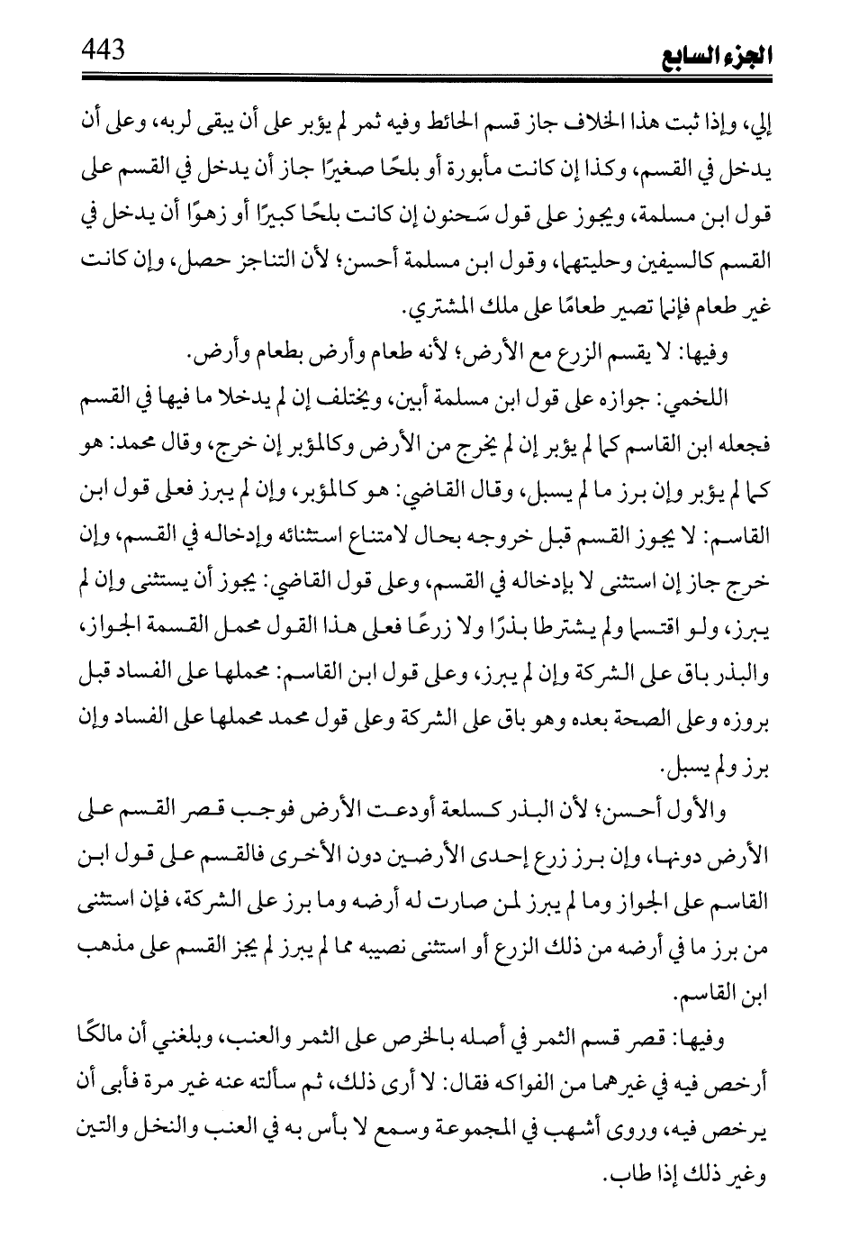 وفيها: إن قسما الرطب فالخرص وتركاه أو أحدهما حتى أتمر لم يبطل قسمه، وإن قسما صغير البلح وتركاه حتى كبر فإن قسماه على تفاضل أو تساو وهو إذا كبر تفاضل انتقض قسمه، وإلا فلا إلا أن يزهى كله أو بعضه فينتقض فيه، فإن أكل أحدهما كل حظه، والآخر نصفه فقط بطل فيما أزهى، ورد آكل كل حظه نصف قيمة ما جذ يقتسمانه مع ما أزهى.
