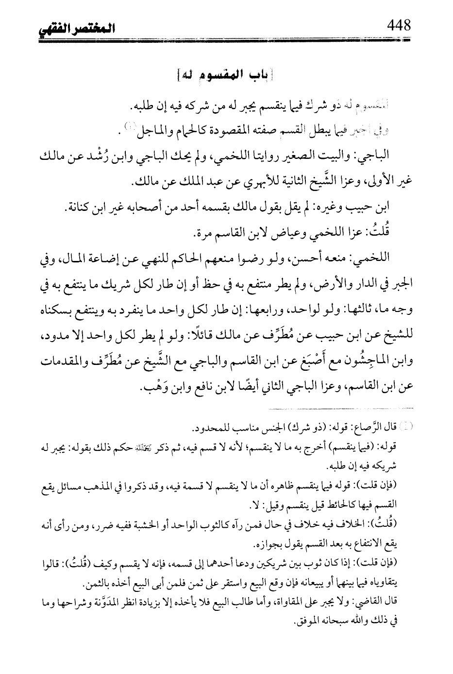 الباجي: ما لا يقسم إلا بضرر منه ما لا يمكن ذلك فيه كالعبد والدابة وما يمكن فيه كالشقة والحبل والخشبة.