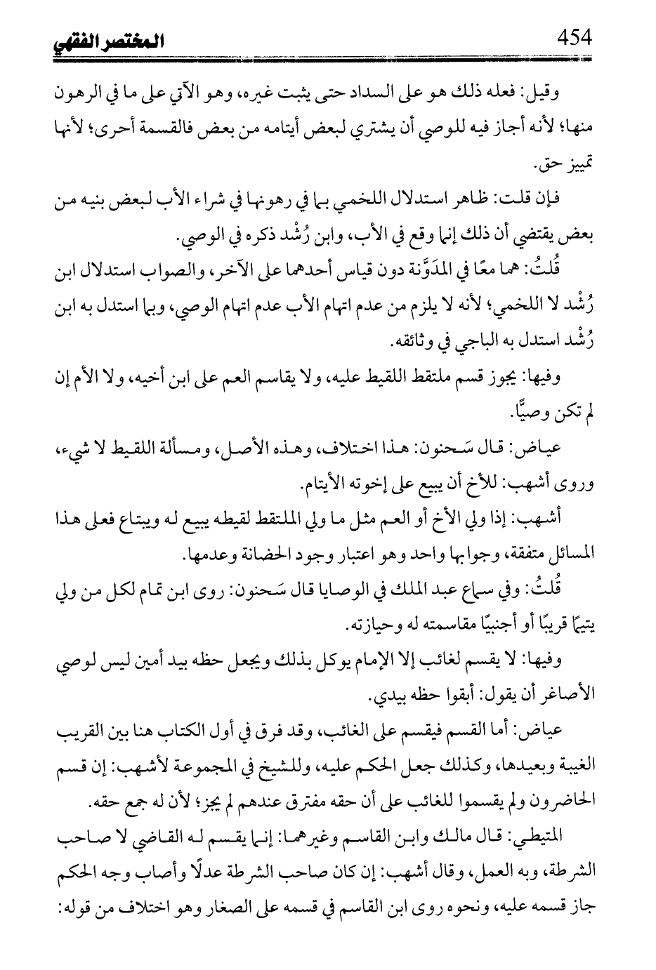 قال: كأخذه النفقة للأصاغر وإقراره حظ الغائب، وكنفقته عليهم من فاضل التركة عن دين الميت ذلك جائز، وتلف مصاب الغائب ودين الغريم منهما، وهو أصوب إن كان قسمه لهم من صبرة واحدة أو من كل صبرة، وإن أخذ لمن يليه صبرة ووقف للغائب أخرى فلا؛ لأنه مما تختلف فيه الأغراض، ولا يجوز ذلك في العروض والعبيد.