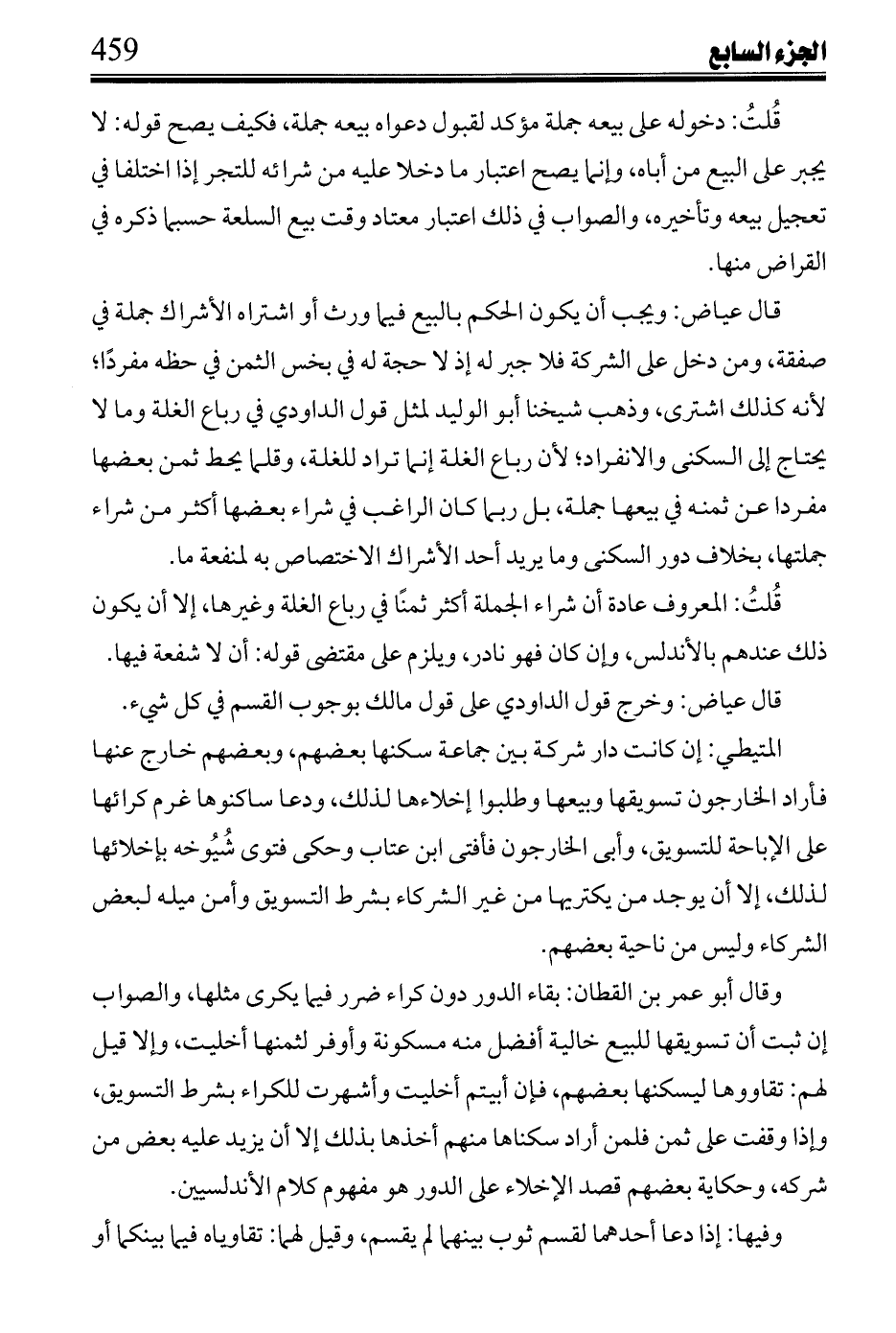 وفي آخره: وقاله ابن القاسم، وبه أفتى الشيوخ وعمل القضاة، وفي لفظه إجمال حاصله عندي ما ذكرته، ففي كون الشريك أحق بما بلغ المبيع المشترك مطلقا أو إن لم يكن الطالب بيعه ثالثها: إن لم يكن قصد إخراج شريكه منه لأخذ غير واحد منها ولأبي عمر ونقل عياض.