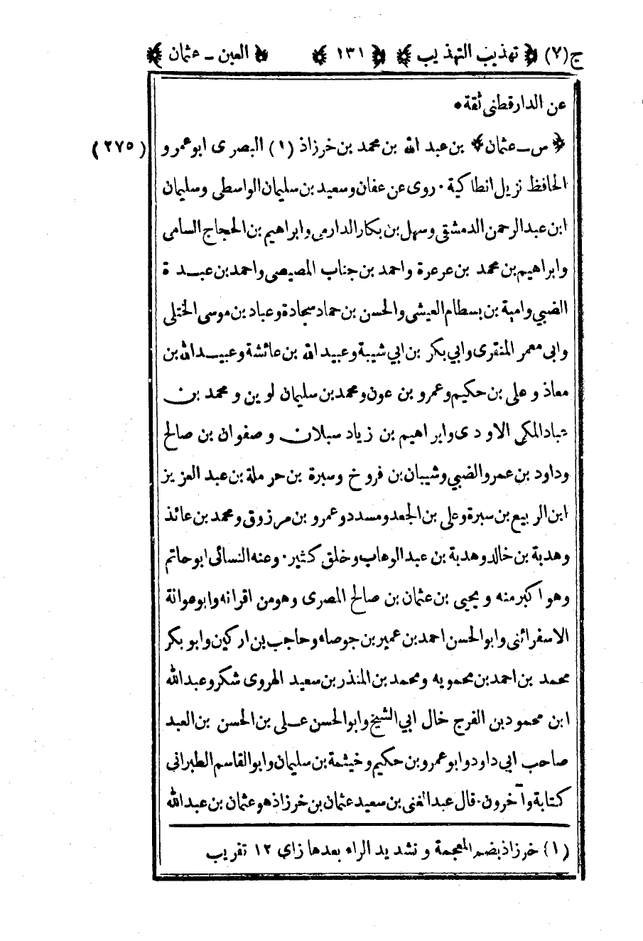 275- "س – عثمان" بن عبد الله بن محمد بن خرزاذ1 البصري أبو عمرو الحافظ نزيل أنطاكية روى عن عفان وسعيد بن سليمان الواسطي وسليمان بن عبد الرحمن الدمشقي وسهل بن بكار الدارمي وإبراهيم بن الحجاج السامي وإبراهيم بن محمد بن عرعرة وأحمد بن جناب المصيصي وأحمد بن عبدة الضبي وأمية بن بسطام العيشي والحسن بن حماد سجادة وعباد بن موسى الختلي وأبي معمر المنقري وأبي بكر بن أبي شيبة وعبيد الله بن عائشة وعبيد الله بن معاذ وعلي بن حكيم وعمرو بن عون ومحمد بن سليمان لوين ومحمد بن عباد المكي الأودي وإبراهيم بن زياد سبلان وصفوان بن صالح وداود بن عمرو الضبي وشيبان بن فروخ وسبرة بن حرملة بن عبد العزيز بن الربيع بن سبرة وعلي بن الجعد ومسدد وعمرو بن مرزوق محمد بن عائذ وهدبة بن خالد وهدبة بن عبد الوهاب وخلق كثير وعنه النسائي وأبو حاتم وهو أكبر منه ويحيى بن عثمان بن صالح المصري وهو من أقرانه وأبو عوانة الإسفرائيني وأبو الحسن أحمد بن عمير بن جوصاء وحاجب بن أركين وأبو بكر محمد بن أحمد بن محمويه ومحمد بن المنذر بن سعيد الهروي شكر وعبد الله بن محمود بن الفرج خال أبي الشيخ وأبو الحسن علي بن الحسن بن العبد صاحب أبي داود وأبو عمرو بن حكيم وخيثمة بن سليمان وأبو القاسم الطبراني كتابه وآخرون قال عبد الغني بن سعيد وعثمان بن خرزاذ هو عثمان بن عبد الله