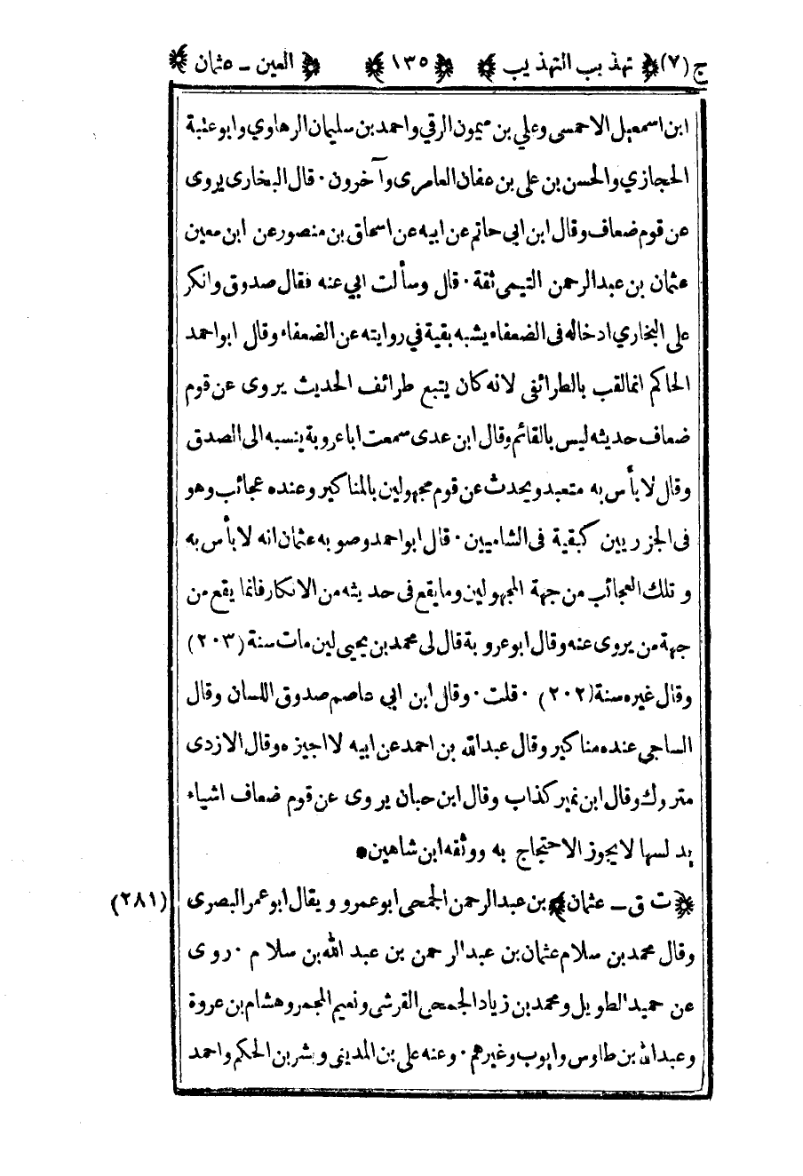 281- "ت ق عثمان" بن عبد الرحمن الجمحي أبو عمرو ويقال أبو عمر البصري وقال محمد بن سلام عثمان بن عبد الرحمن بن عبد الله بن سلام روى عن حميد الطويل ومحمد بن زياد الجمحي القرشي ونعيم المجمر وهشام بن عروة وعبد الله بن طاوس وأيوب وغيرهم وعنه علي بن المديني وبشر بن الحكم وأحمد
