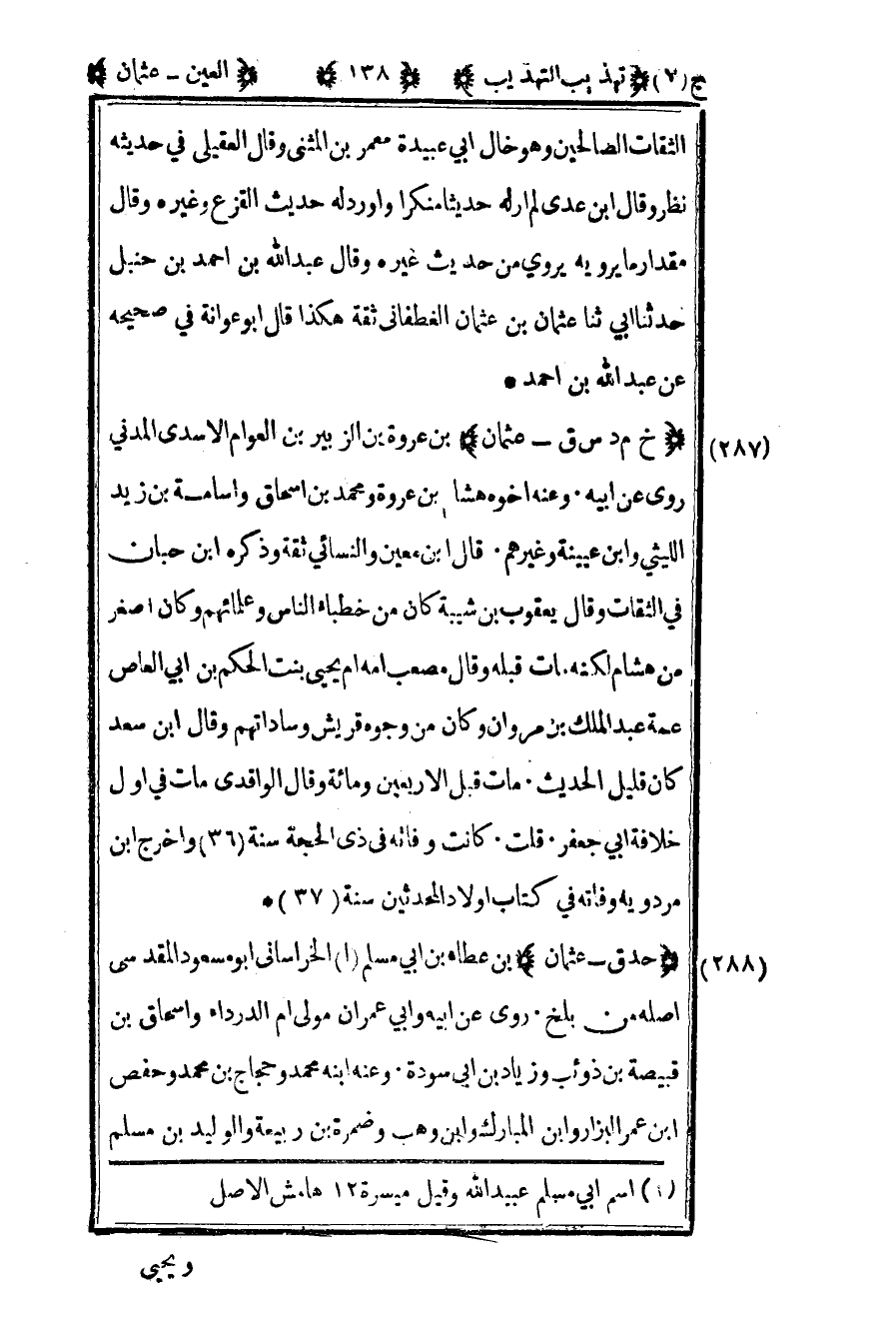 288- "حد ق – عثمان" بن عطاء بن أبي مسلم1 الخراساني أبو مسعود المقدسي أصله من بلخ روى عن أبيه وأبي عمران مولى أم الدرداء وإسحاق بن قبيصة بن ذؤيب وزياد بن أبي سودة وعنه ابنه محمد وحجاج بن محمد وحفص بن عمر البزار وابن المبارك وابن وهب وضمرة بن ربيعة والوليد بن مسلم