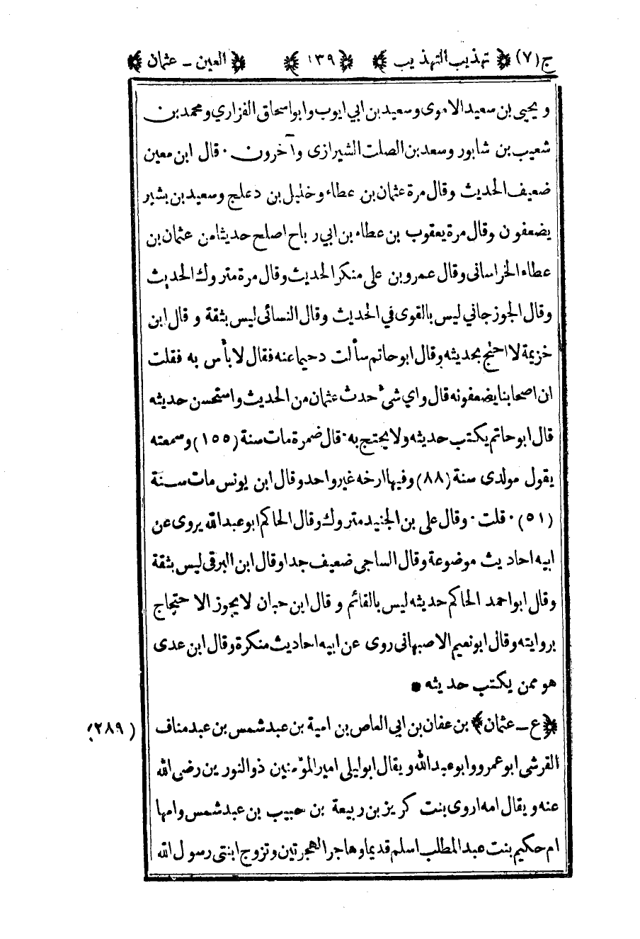289- "ع – عثمان" بن عفان بن أبي العاص بن أمية بن عبد شمس بن عبد مناف القرشي أبو عمرو وأبو عبد الله ويقال أبو ليلى أمير المؤمنين ذو النورين رضي الله عنه ويقال أمه أروى بنت كريز بن ربيعة بن حبيب بن عبد شمس وأمها أم حكيم بنت عبد المطلب أسلم قديما وهاجر الهجرتين وتزوج ابنتي رسول الله