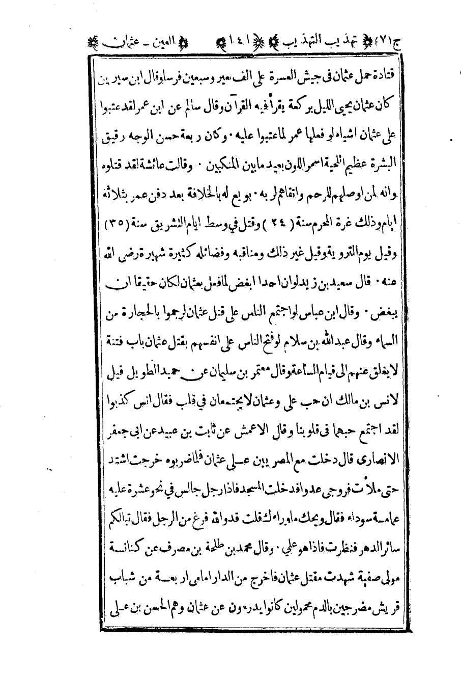 قتادة حمل عثمان في جيش العسرة على ألف بعير وسبعين فرسا وقال بن سيرين كان عثمان يحيى الليل بركعة يقرأ فيه القرآن وقال سالم عن بن عمر لقد عتبوا على عثمان أشياء لو فعلها عمر لما عتبوا عليه وكان ربعة حسن الوجه رقيق البشرة عظيم اللحية أسمر اللون بعيد ما بين المنكبين وقالت عائشة لقد قتلوه وإنه لمن أوصلهم للرحم وأتقاهم لربه بويع له بالخلافة بعد دفن عمر بثلاثة أيام وذلك غرة المحرم سنة 24 وقتل في وسط أيام التشريق سنة 35 وقيل يوم التروية وقيل غير ذلك ومناقبه وفضائله كثيرة شهيرة رضي الله عنه قال سعيد بن زيد لو أن أحدا أبغض لما فعل بعثمان لكان حقيقا أن يبغض وقال بن عباس لو اجتمع الناس على قتل عثمان لرجموا بالحجارة من السماء وقال عبد الله بن سلام لو فتح الناس على أنفسهم بقتل عثمان باب فتنة لا يغلق عنهم إلى قيام الساعة وقال معتمر بن سليمان بن حميد الطويل قيل لأنس بن مالك أن حب علي وعثمان لا يجتمعان في قلب فقال أنس كذبوا لقد اجتمع حبهما في قلوبنا وقال الأعمش عن ثابت بن عبيد عن أبي جعفر الأنصاري قال دخلت مع المصريين على عثمان فلما ضربوه خرجت أشتد حتى ملأت فروجي عدوا فدخلت المسجد فإذا رجل جالس في نحو عشرة عليه عمامة سوداء فقال ويحك ما وراءك قلت قد والله فرغ من الرجل فقال تبا لكم سائر الدهر فنظرت فإذا هو علي وقال محمد بن طلحة بن مصرف عن كنانة مولى صفية شهدت مقتل عثمان فأخرج من الدار أمامي أربعة من شباب قريش مضرجين بالدم محمولين كانوا يدرأون عن عثمان وهم الحسن بن علي