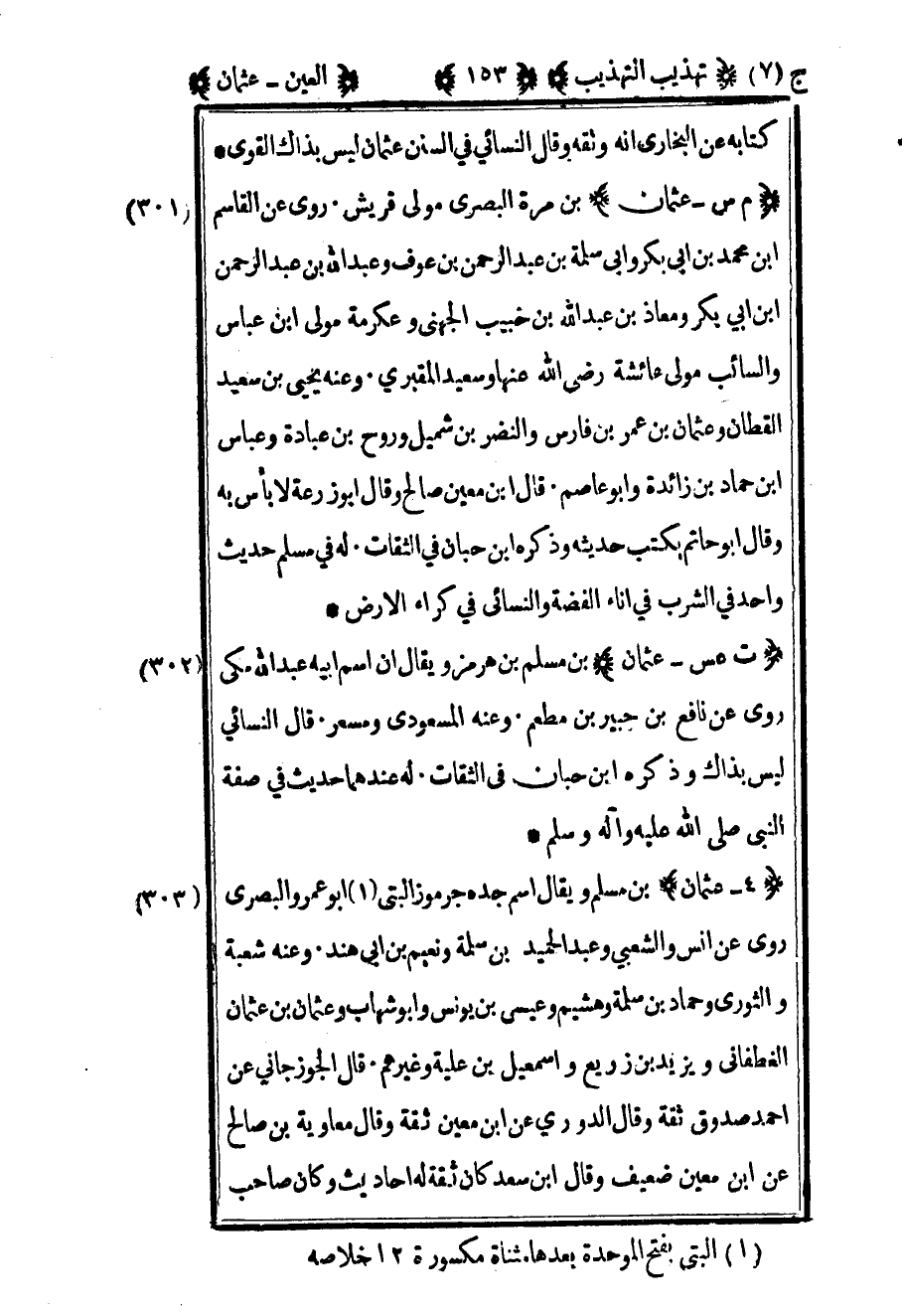 303- "ت عس – عثمان" بن مسلم بن هرمز ويقال أن اسم أبيه عبد الله مكي روى عن نافع بن جبير بن مطعم وعنه المسعودي ومسعر قال النسائي ليس بذاك وذكره بن حبان في الثقات له عندهما حديث في صفة النبي صلى الله عليه وسلم