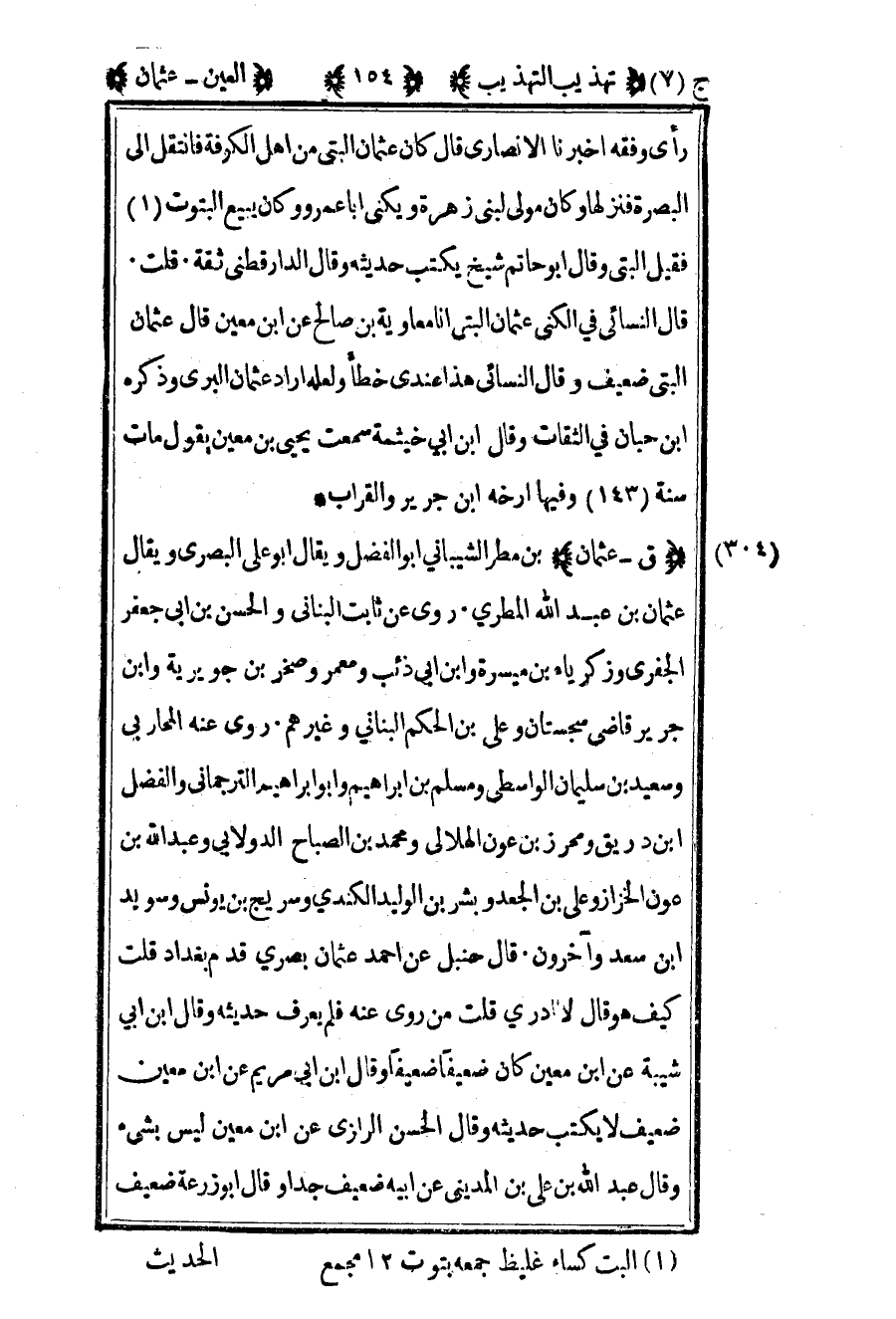 رأي وفقه أخبرنا الأنصاري قال كان عثمان البتي من أهل الكوفة فانتقل إلى البصرة فنزلها وكان مولى لبني زهرة ويكنى أبا عمرو وكان يبيع البتوت1 فقيل البتي وقال أبو حاتم شيخ يكتب حديثه وقال الدارقطني ثقة قلت قال النسائي في الكنى عثمان البتي أنا معاوية بن صالح عن بن معين قال عثمان البتي ضعيف وقال النسائي هذا عندي خطأ ولعله أراد عثمان البري وذكره بن حبان في الثقات وقال بن أبي خيثمة سمعت يحيى بن معين يقول مات سنة 143 وفيها أرخه بن جرير والقراب