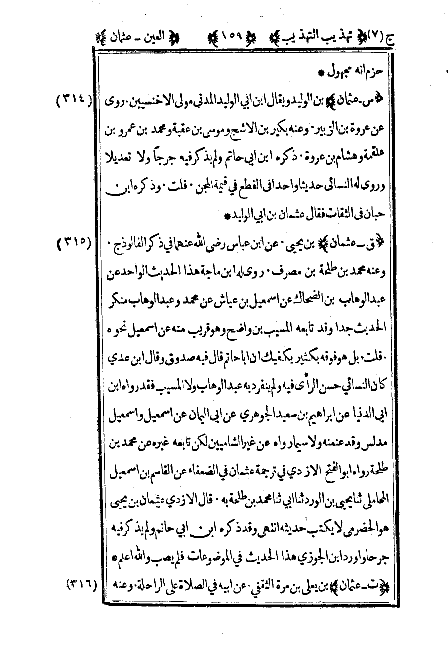 315- "س – عثمان" بن الوليد ويقال بن أبي الوليد المدني مولى الأخنسيين روى عن عروة بن الزبير وعنه بكير بن الأشج وموسى بن عقبة ومحمد بن عمرو بن علقمة وهشام بن عروة ذكره بن أبي حاتم ولم يذكر فيه جرحا ولا تعديلا وروى له النسائي حديثا واحدا في القطع في قيمة المجن قلت وذكره بن حبان في الثقات فقال عثمان بن أبي الوليد