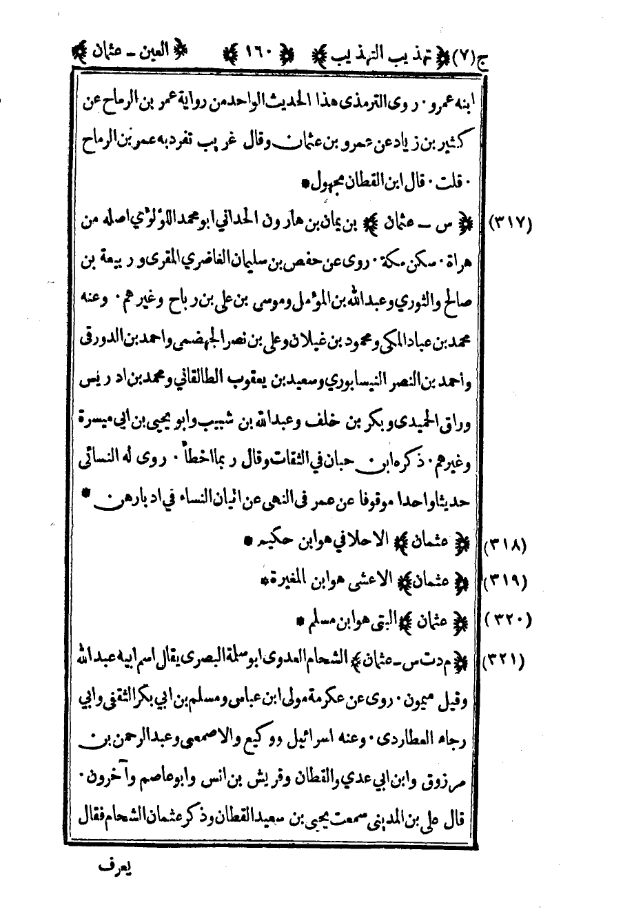 318- "س – عثمان" بن يمان بن هارون الحداني أبو محمد اللؤلؤي أصله من هراة سكن مكة روى عن حفص بن سليمان الغاضري المقري وربيعة بن صالح والثوري وعبد الله بن المؤمل وموسى بن علي بن رباح وغيرهم وعنه محمد بن عباد المكي ومحمود بن غيلان وعلي بن نصر الجهضمي وأحمد بن الدورقي وأحمد بن النصر النيسابوري وسعيد بن يعقوب الطالقاني ومحمد بن إدريس وراق الحميدي وبكر بن خلف وعبد الله بن شبيب وأبو يحيى بن أبي ميسرة وغيرهم ذكره بن حبان في الثقات وقال ربما أخطأ روى له النسائي حديثا واحدا موقوفا عن عمر في النهي عن إتيان النساء في أدبارهن