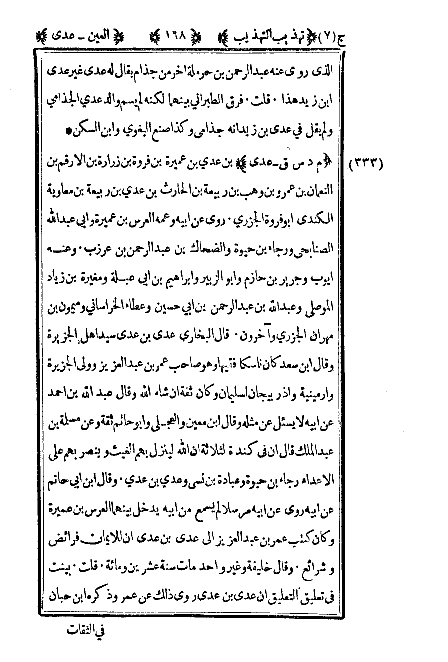334- "م د س ق – عدي" بن عدي بن عميرة بن فروة بن زرارة بن الأرقم بن النعمان بن عمرو بن وهب بن ربيعة بن الحارث بن ربيعة بن معاوية الكندي أبو فروة الجزري روى عن أبيه وعمه العرس بن عميرة وأبي عبد الله الصنابحي ورجاء بن حيوة والضحاك بن عبد الرحمن بن عرزب وعنه أيوب وجرير بن حازم وأبو الزبير وإبراهيم بن أبي عبلة ومغيرة بن زياد الموصلي وعبد الله بن عبد الرحمن بن أبي حسين وعطاء الخراساني وميمون بن مهران الجزري وآخرون قال البخاري عدي بن عدي سيد أهل الجزيرة وقال بن سعد كان ناسكا فقيها وهو صاحب عمر بن عبد العزيز وولي الجزيرة وأرمينية وأذربيجان لسليمان وكان ثقة إن شاء الله وقال عبد الله بن أحمد عن أبيه لا يسأل عن مثله وقال بن معين والعجلي وأبو حاتم ثقة وعن مسلمة بن عبد الملك قال أن في كندة أن الله لينزل بهم الغيث وينصر بهم على الأعداء رجاء بن حيوة وعبادة بن نسي وعدي بن عدي وقال بن أبي حاتم عن أبيه روى عن أبيه مرسلا لم يسمع من أبيه يدخل بينهما العرس بن عميرة وكان كتب عمر بن عبد العزيز إلى عدي بن عدي أن للإيمان فرائض وشرائع وقال خليفة وغير واحد مات سنة عشرين ومائة قلت بينت في تعليق التعليق أن عدي بن عدي روى ذلك عن عمر وذكره ابن حبان
