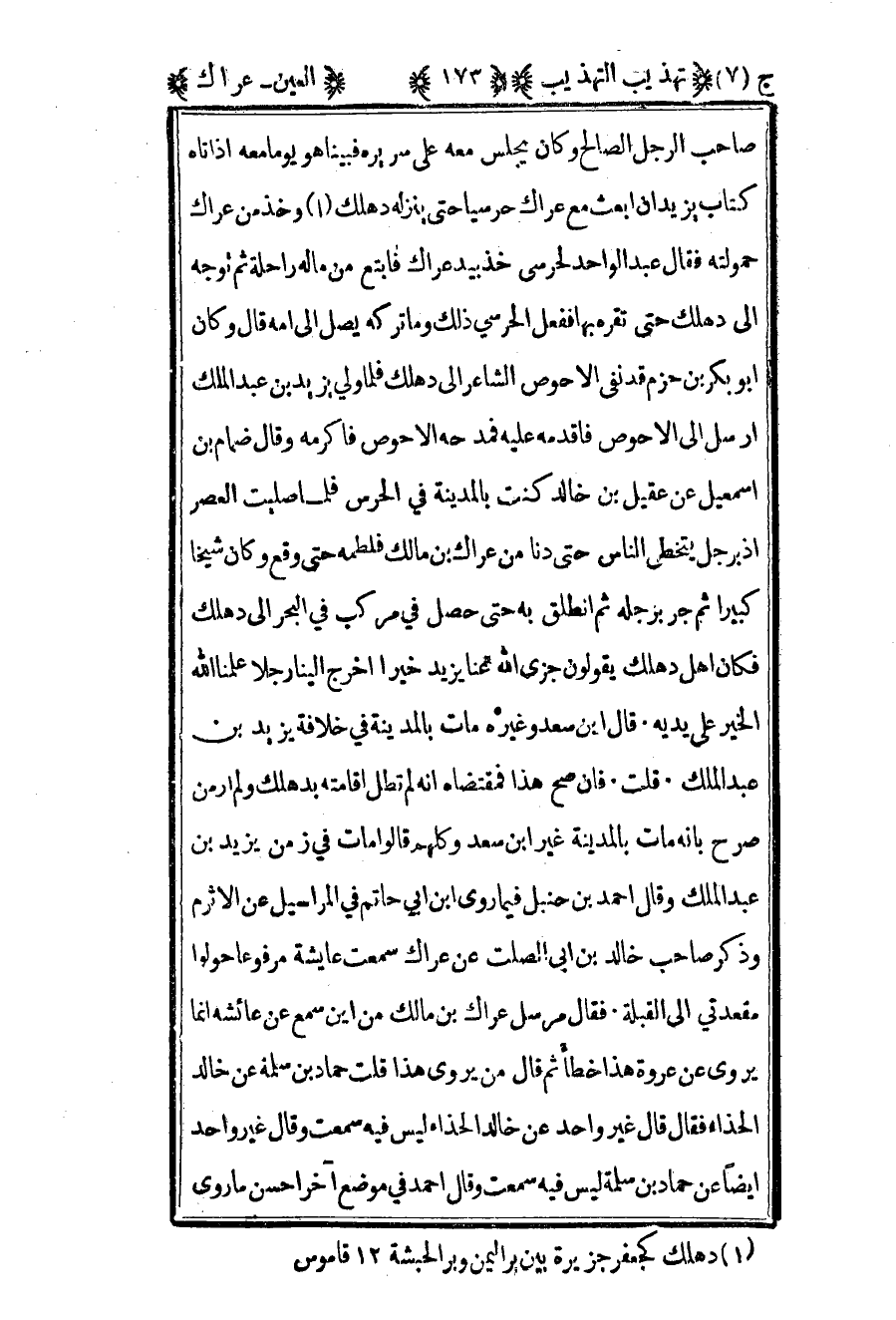 صاحب الرجل الصالح وكان يجلس معه على سريره فبينا هو يوما معه إذ أتاه كتاب يزيد أن ابعث مع عراك حرسيا حتى ينزله دهلك1 وخذ من عراك حمولته فقال عبد الواحد لحرسي خذ بيد عراك فابتع من ماله راحلة ثم توجه إلى دهلك حتى تقره بها ففعل الحرسي ذلك وما تركه يصل إلى أمه قال وكان أبو بكر بن حزم قد نفى الأحوص الشاعر إلى دهلك فلما ولي يزيد بن عبد الملك أرسل إلى الأحوص فاقدمه عليه فمدحه الأحوص فأكرمه وقال ضمام بن إسماعيل عن عقيل بن خالد كنت بالمدينة في الحرس فلما صليت العصر إذ برجل يتخطى الناس حتى دنا من عراك بن مالك فلطمه حتى وقع وكان شيخا كبيرا ثم جر برجله ثم انطلق به حتى حصل في مركب في البحر إلى دهلك فكان أهل دهلك يقولون جزى الله عنا يزيد خيرا أخرج إلينا رجلا علمنا الله الخير على يديه قال بن سعيد وغيره مات بالمدينة في خلافة يزيد بن عبد الملك قلت فإن صح هذا فمقتضاه أنه لم تطل إقامته بدهلك ولم أر من صرح بأنه مات بالمدينة غير بن سعد وكلهم قالوا مات في زمن يزيد بن عبد الملك وقال أحمد بن حنبل فيما روى بن أبي حاتم في المراسيل عن الأثرم وذكر صاحب خالد بن أبي الصلت عن عراك سمعت عائشة مرفوعا حولوا مقعدتي إلى القبلة فقال مرسل عراك بن مالك من أين سمع عن عائشة إنما يروي عن عروة هذا خطأ ثم قال من يروي هذا قلت حماد بن سلمة عن خالد الحذاء فقال قال غير واحد عن خالد الحذاء ليس فيه سمعت وقال غير واحد أيضا عن حماد بن سلمة ليس فيه سمعت وقال أحمد في موضع آخر أحسن ما روى